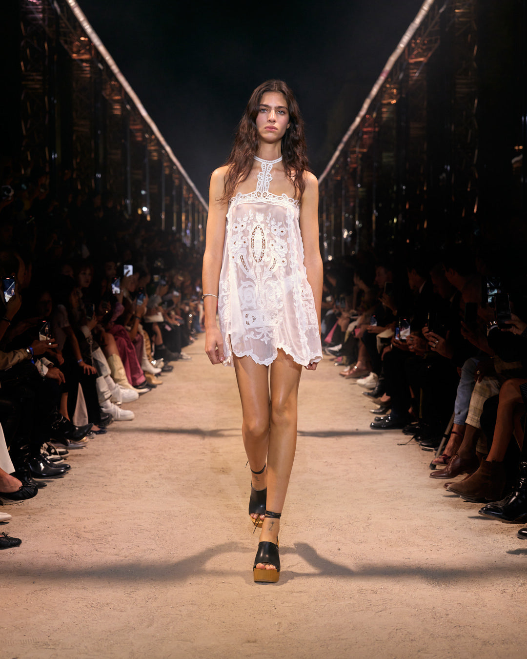 The collection draws inspiration from ornamental Art nouveau curves and radiance. Artisanal embroideries sketch organic motifs on tulle tops and dresses – echoed by intricate lace collars.