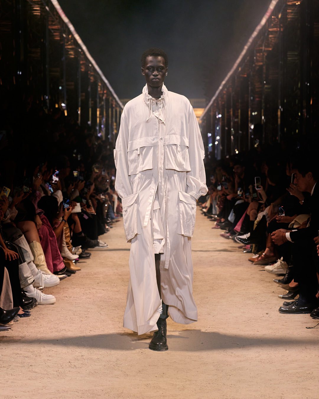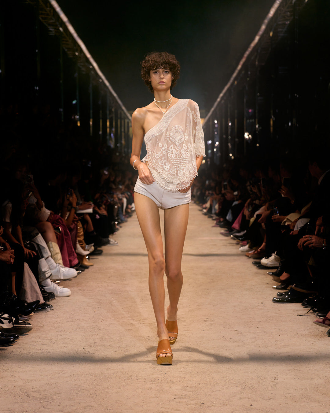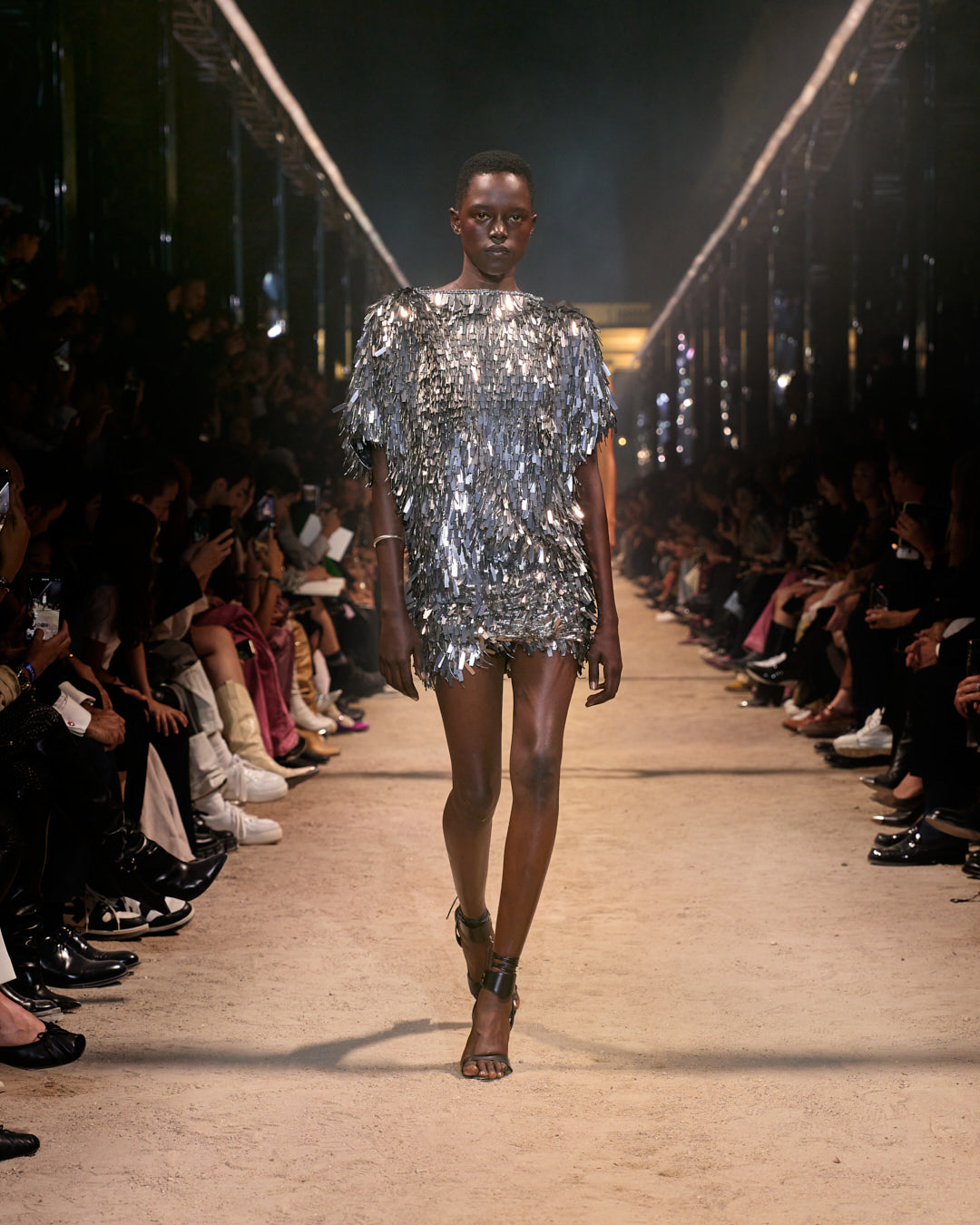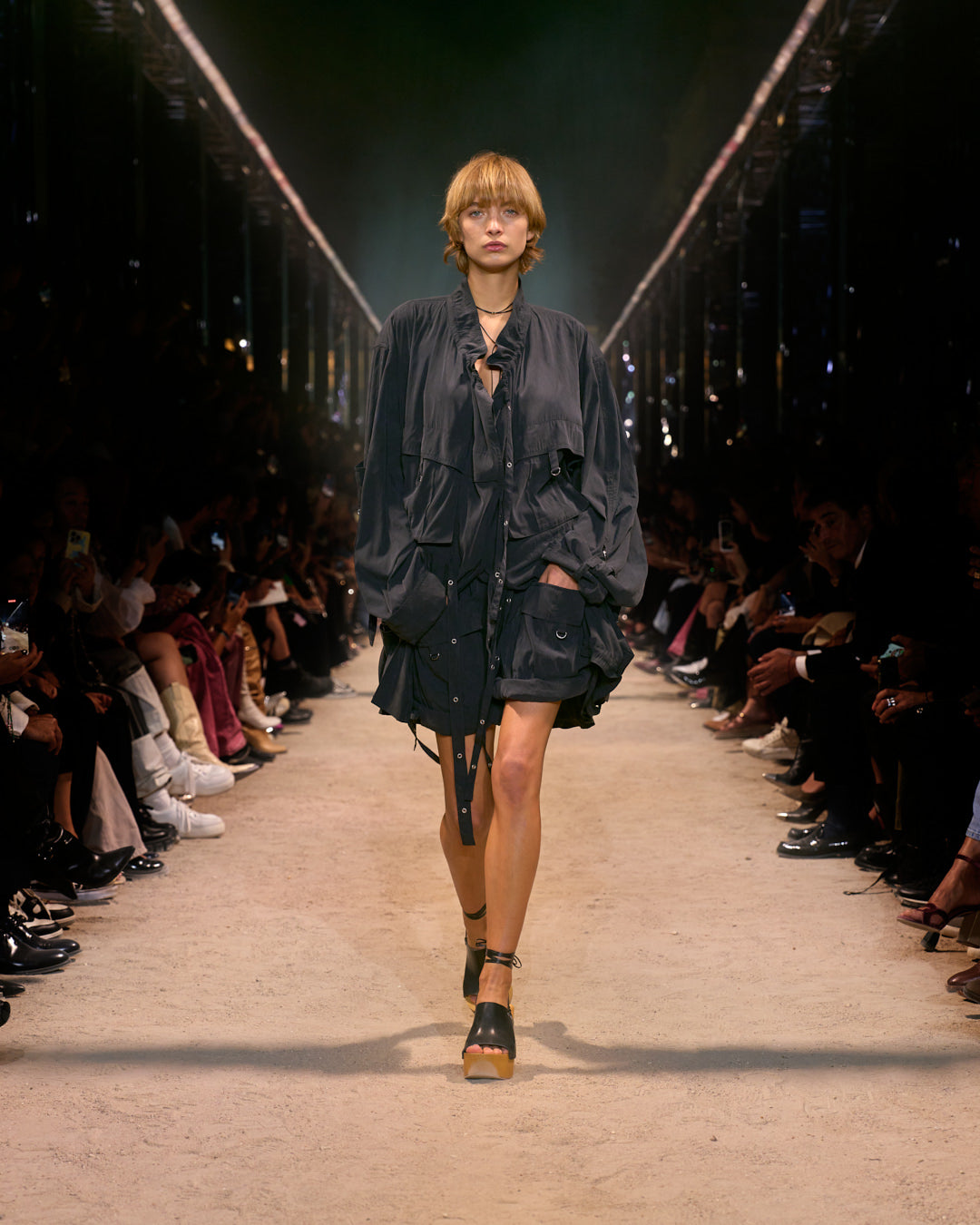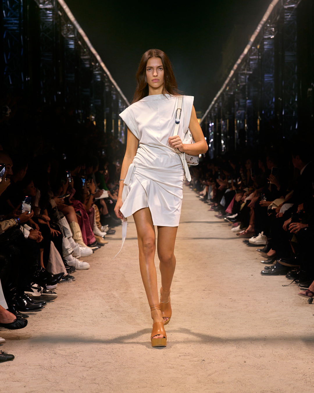 Parachute fabrics and wedge clogs further elevate the silhouette while structural silver earrings levitate like mobiles and sparkle to the rhythm of steps.