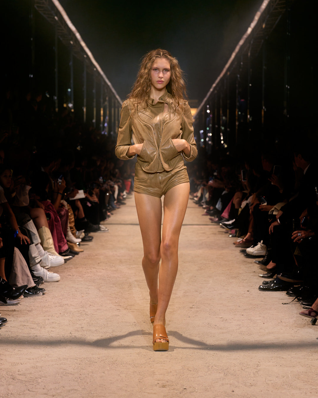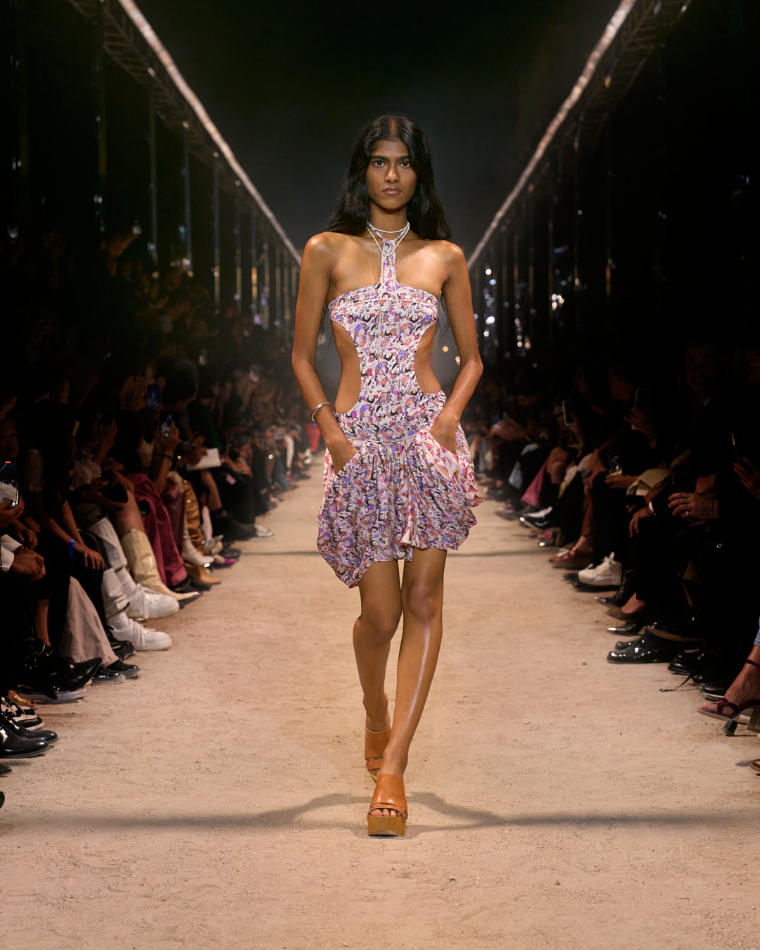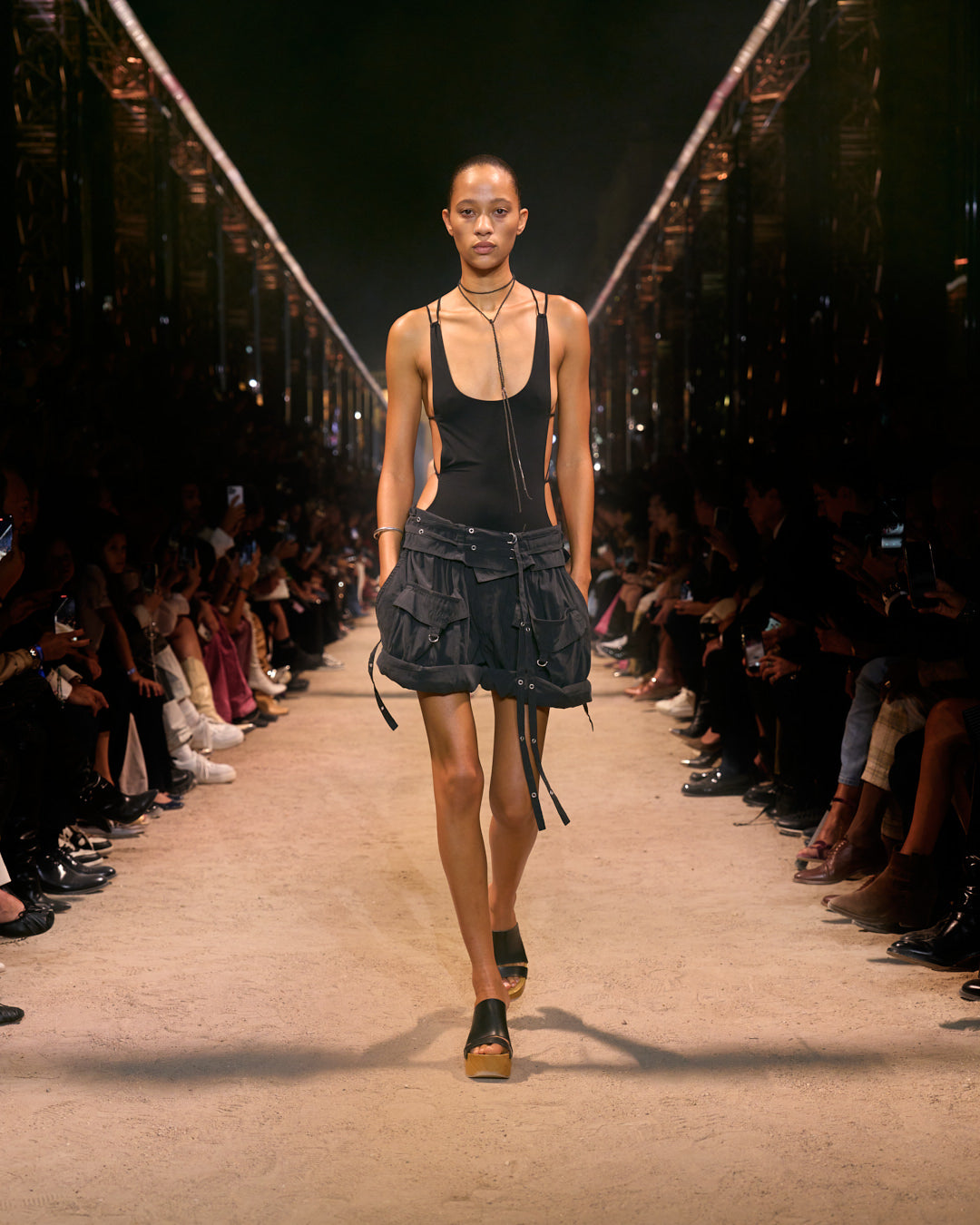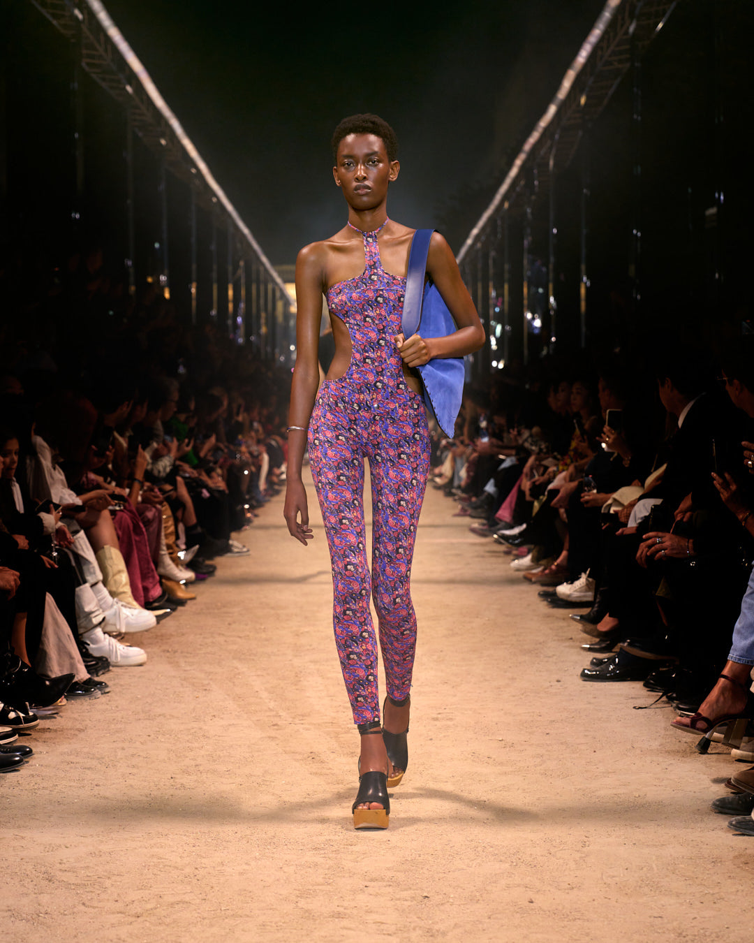 Parachute fabrics and wedge clogs further elevate the silhouette while structural silver earrings levitate like mobiles and sparkle to the rhythm of steps.