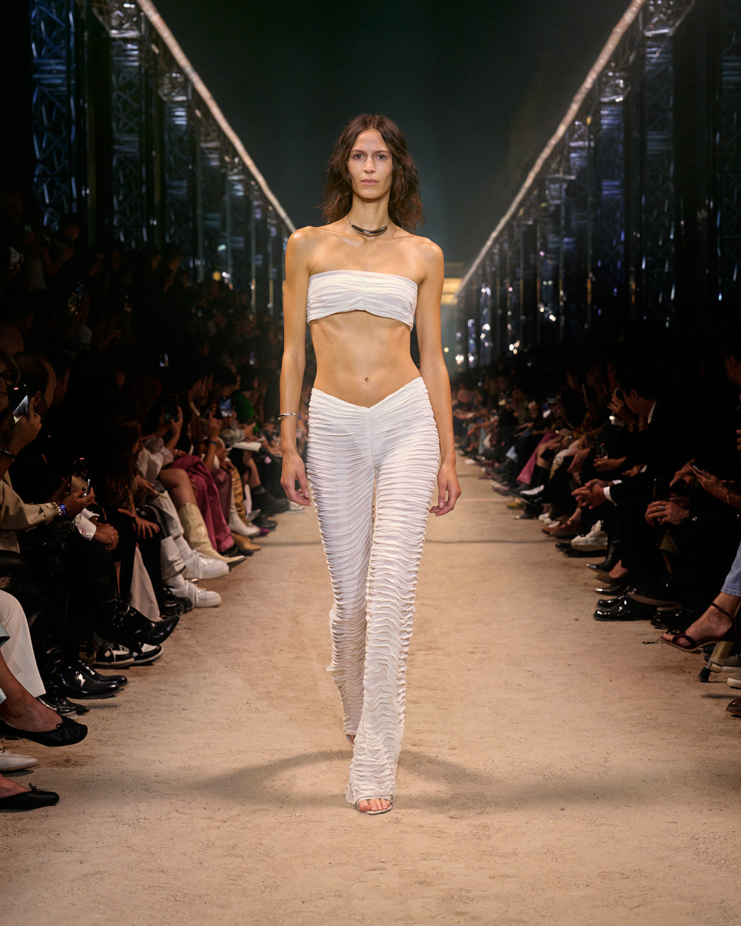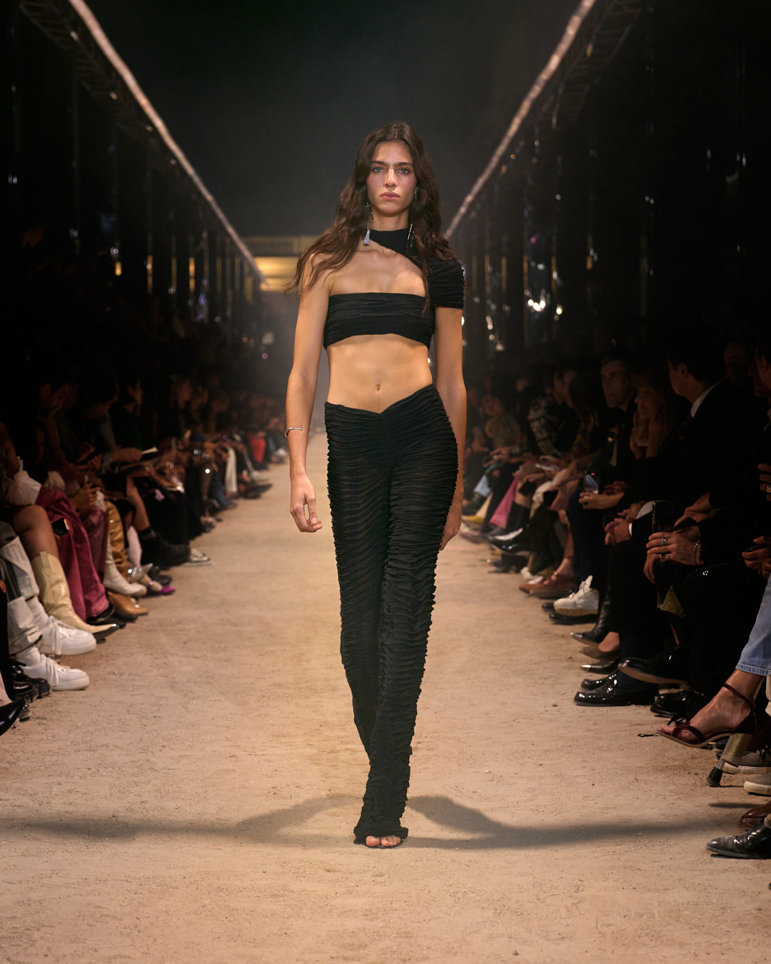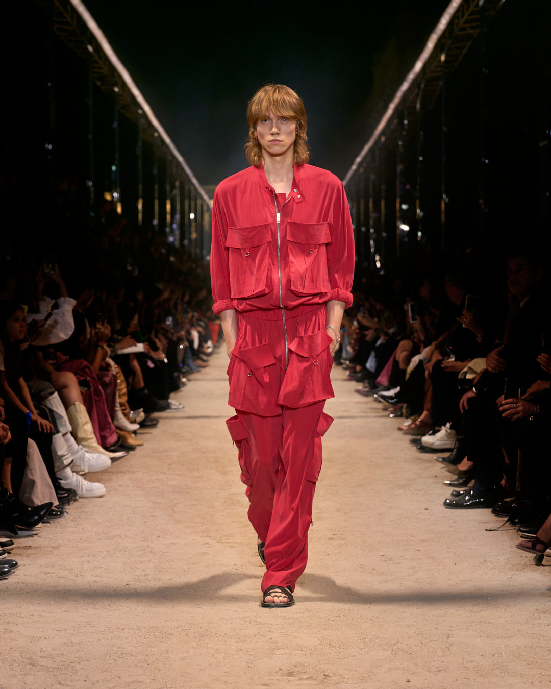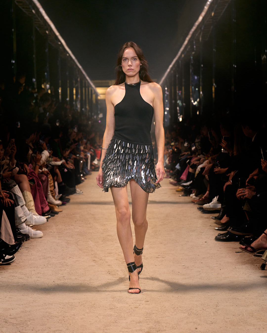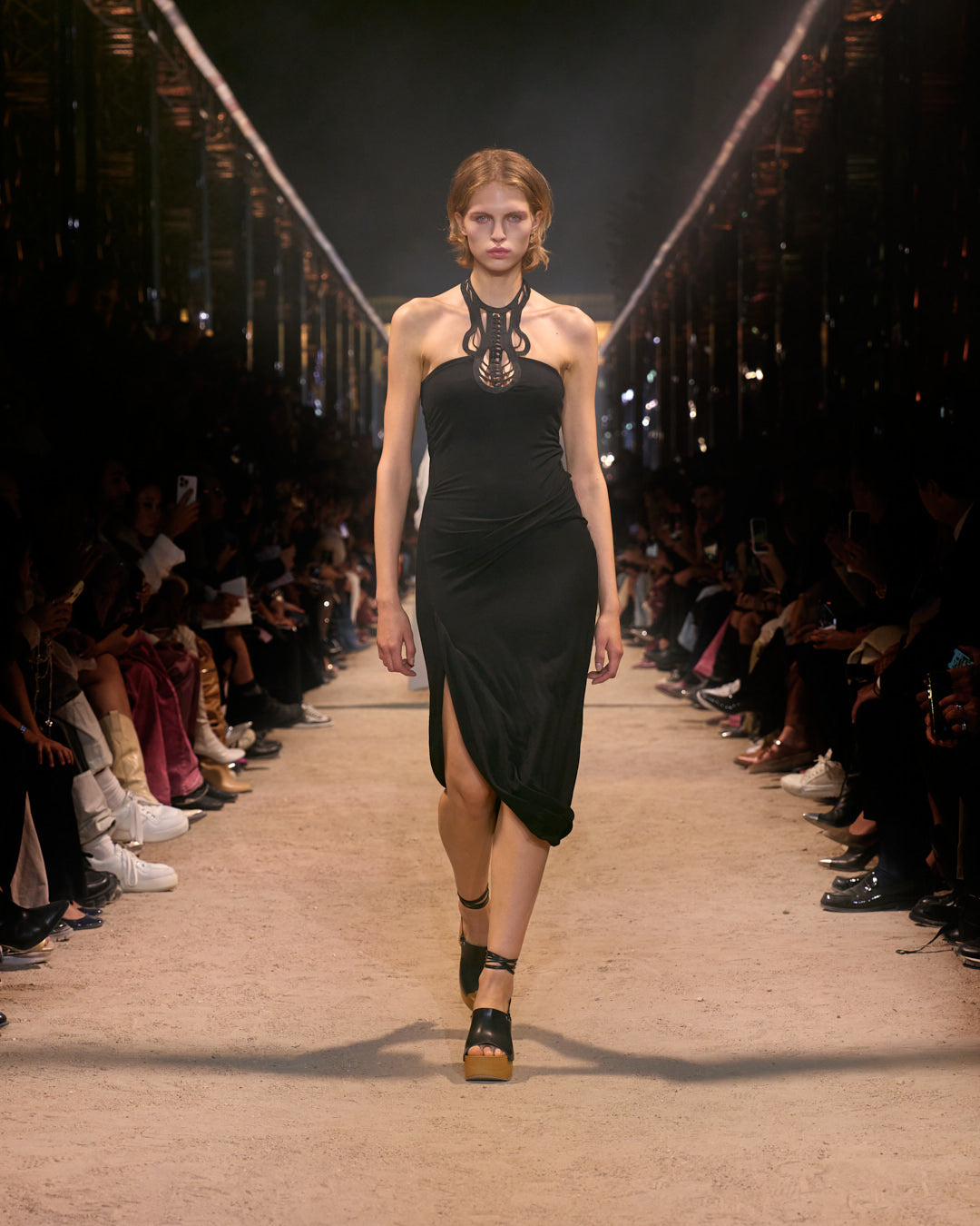 Parachute fabrics and wedge clogs further elevate the silhouette while structural silver earrings levitate like mobiles and sparkle to the rhythm of steps.