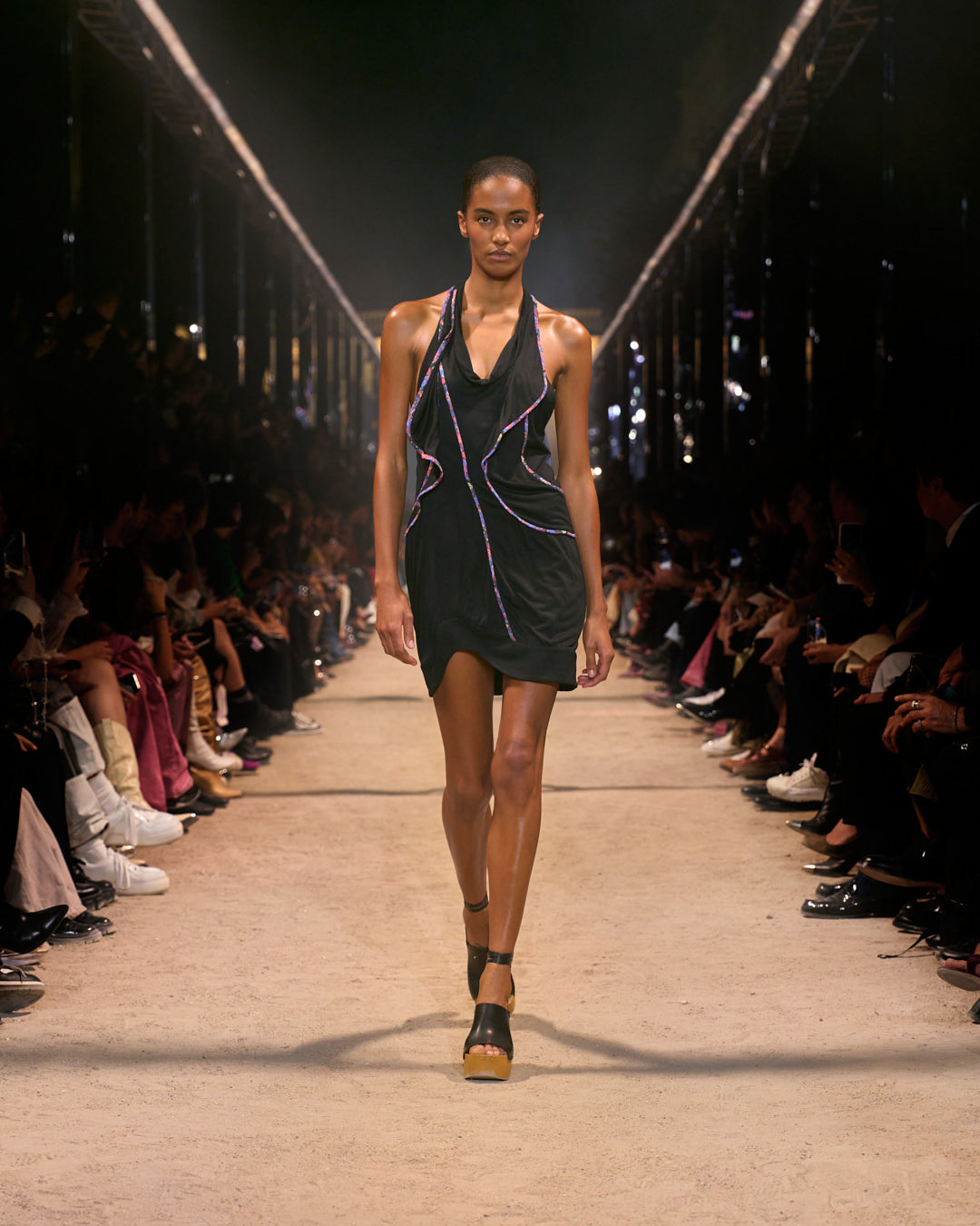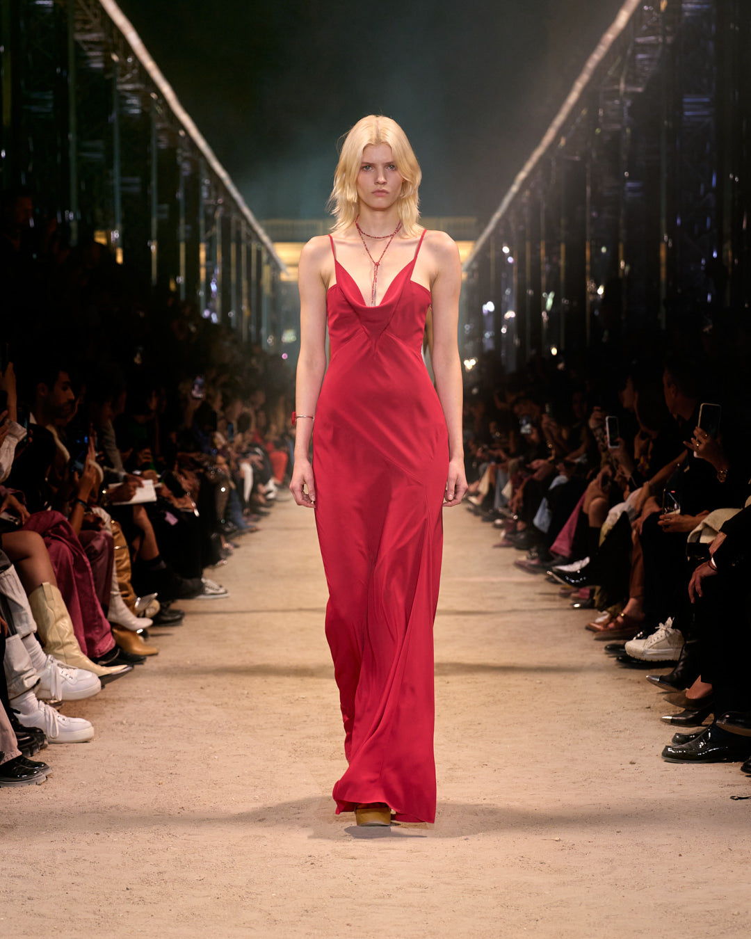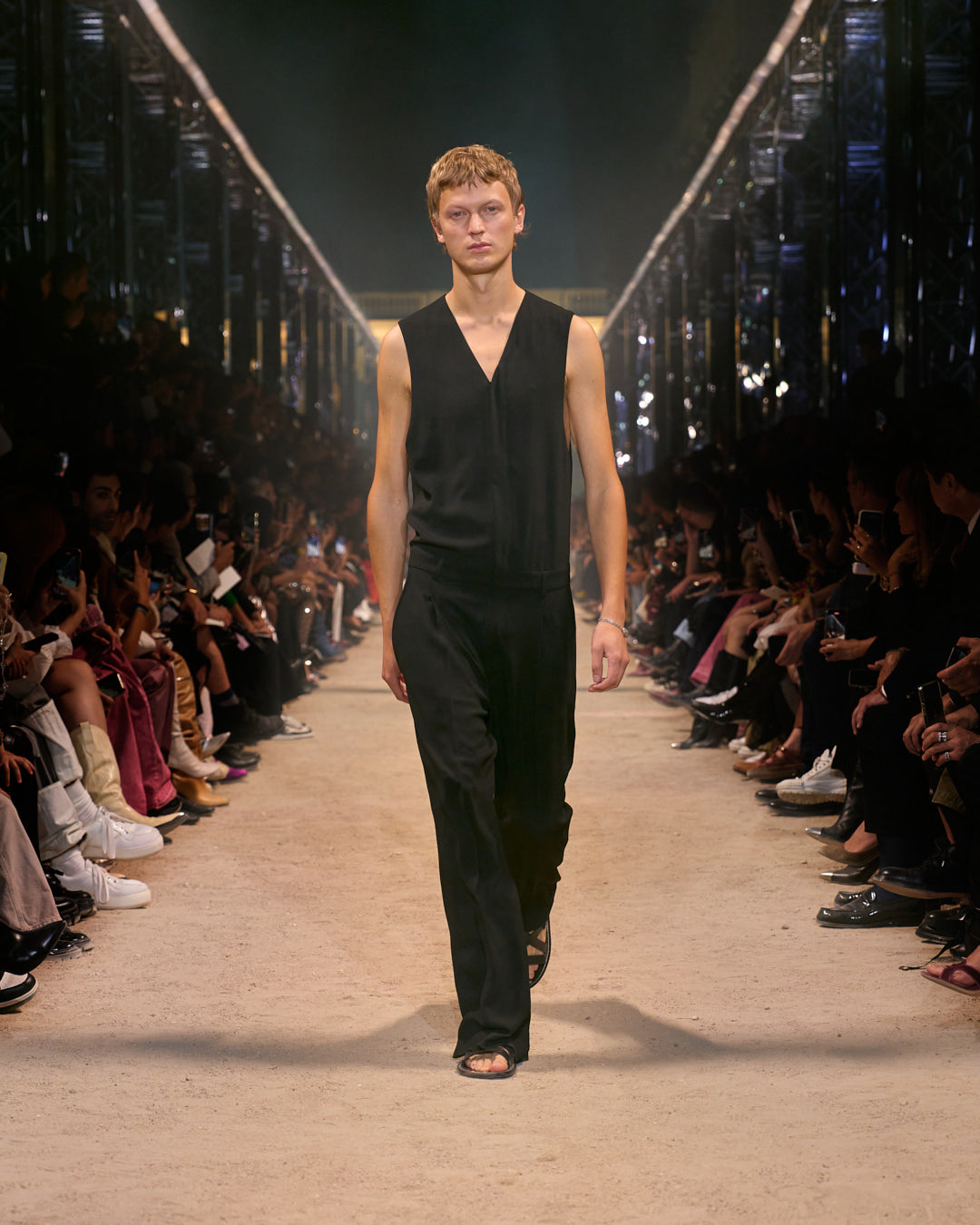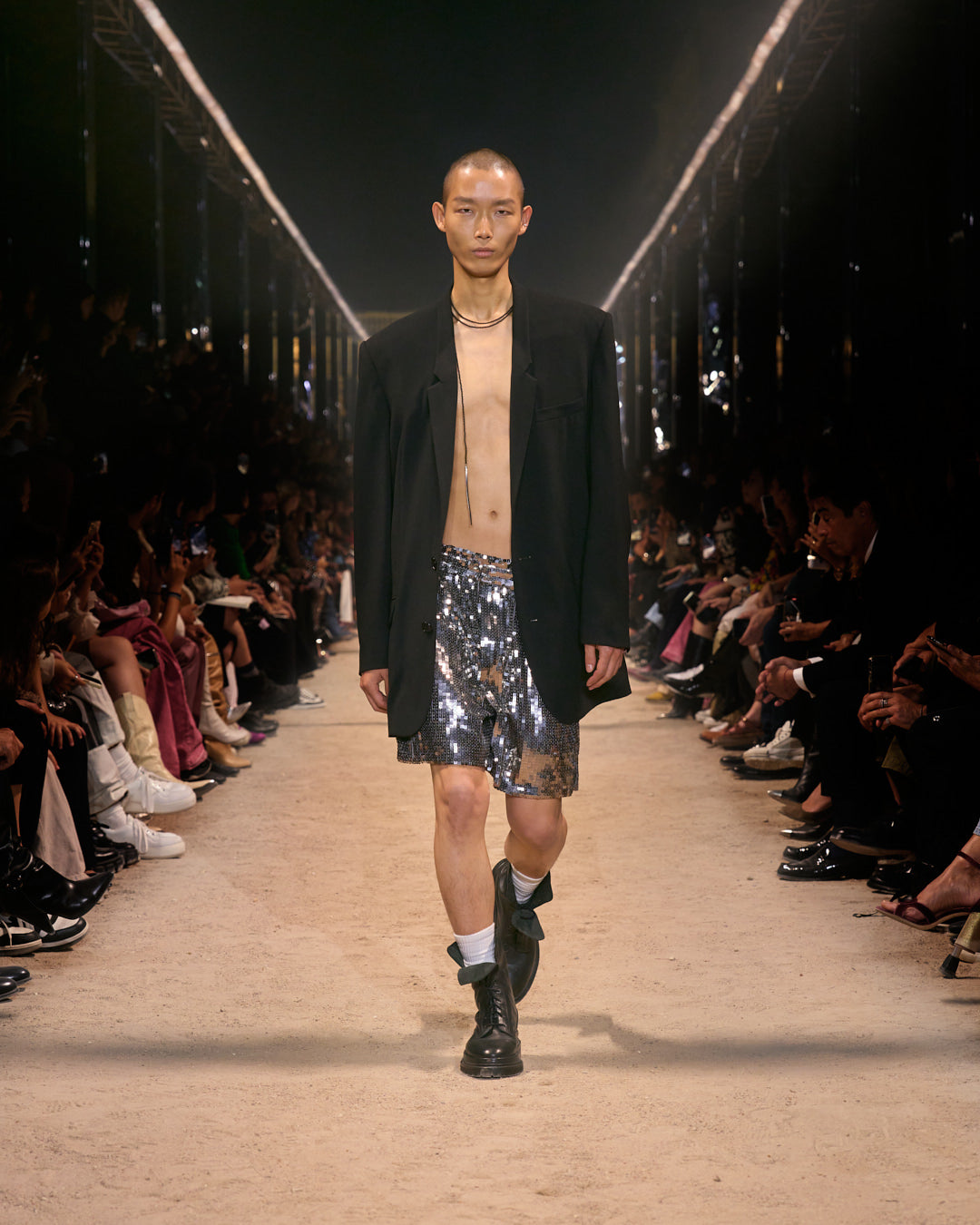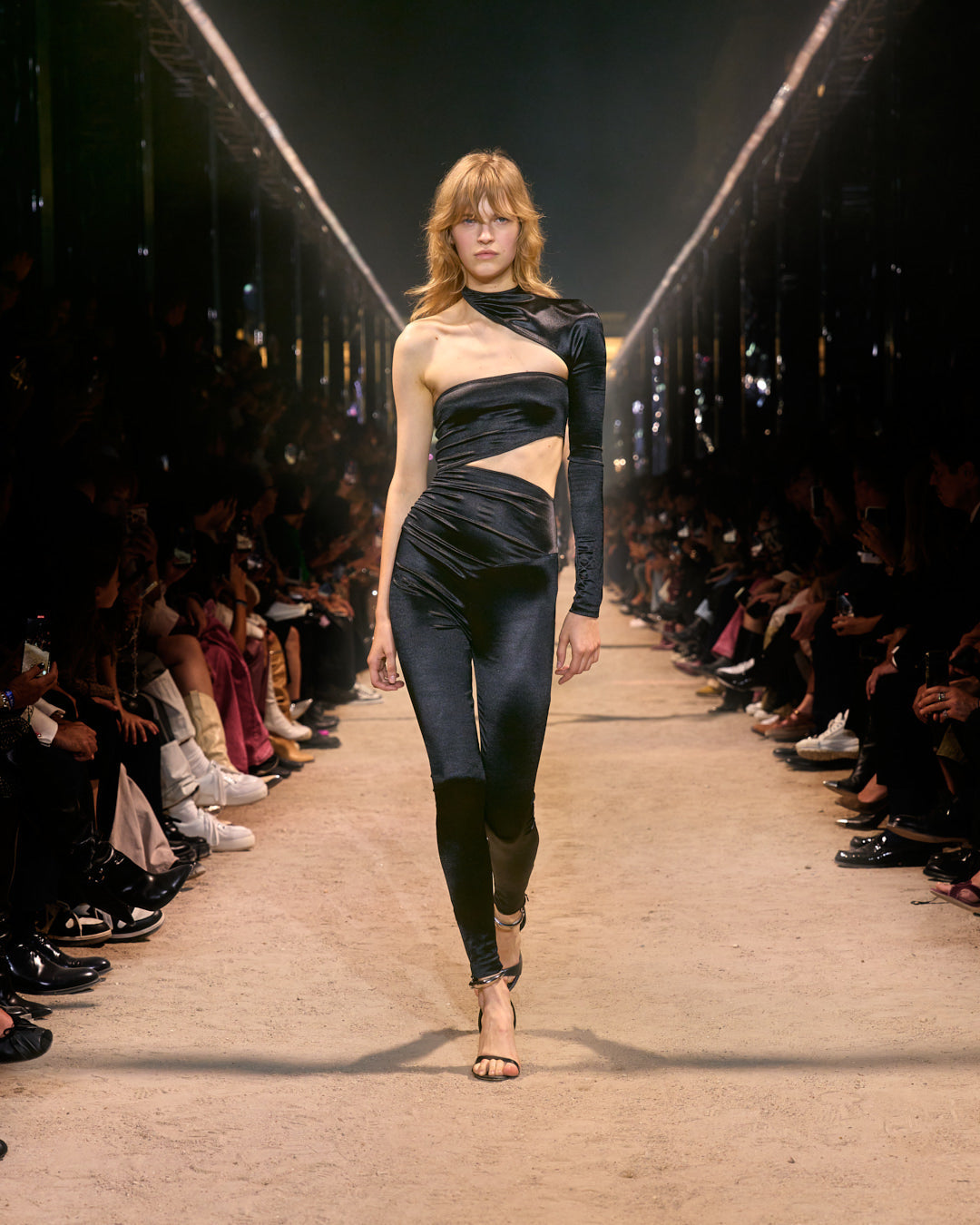 Parachute fabrics and wedge clogs further elevate the silhouette while structural silver earrings levitate like mobiles and sparkle to the rhythm of steps.