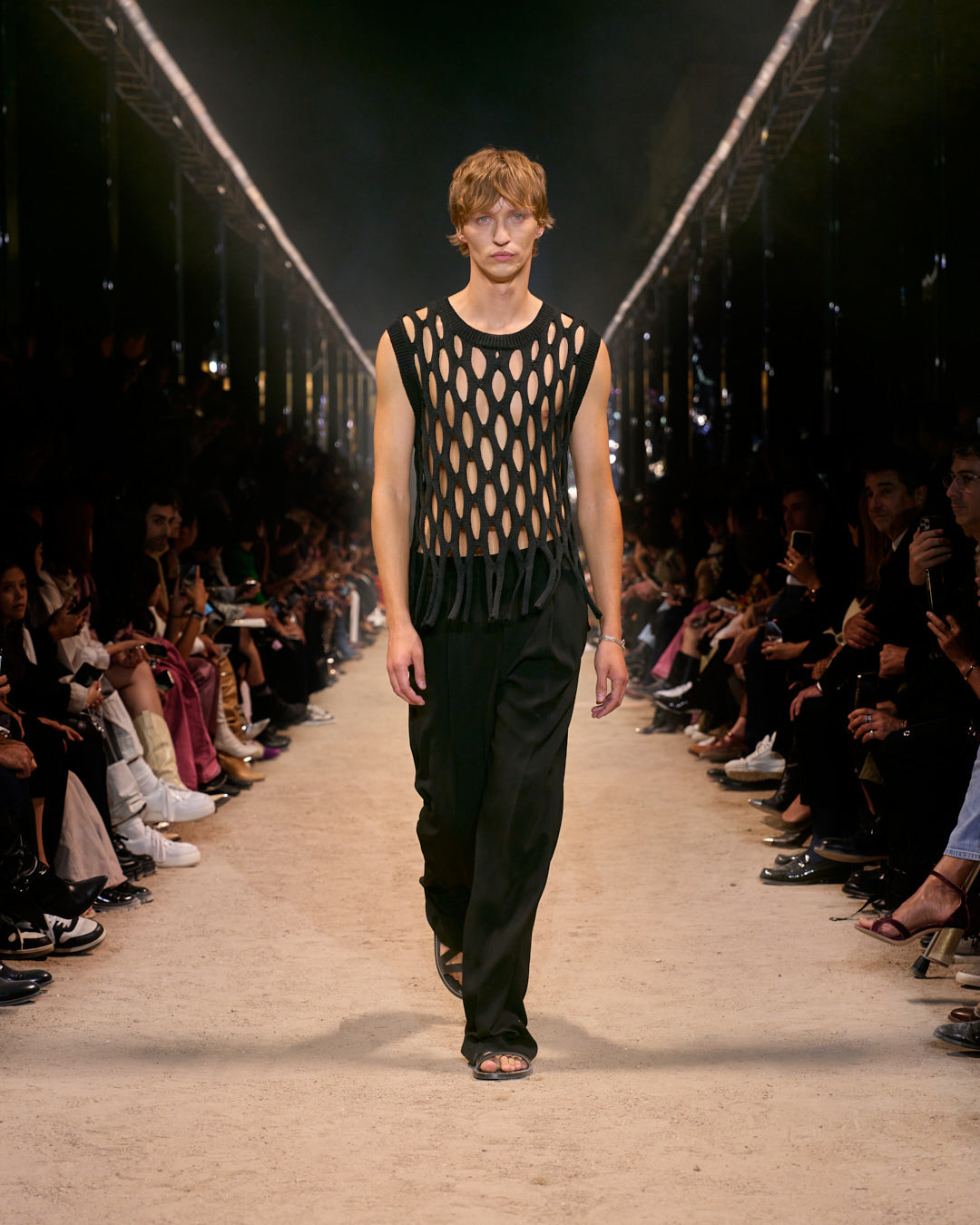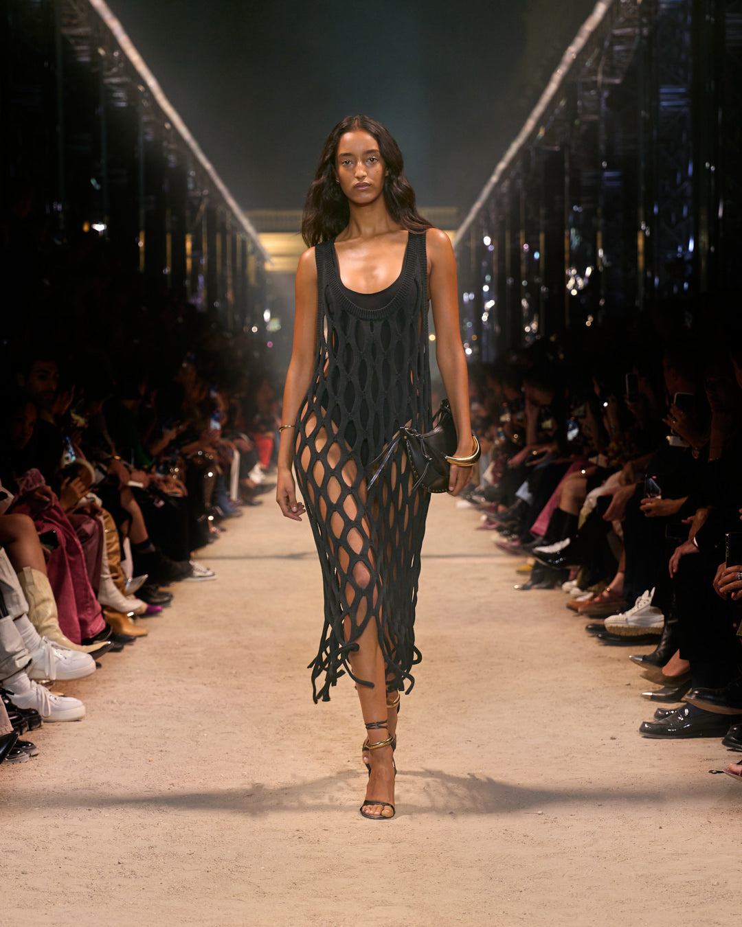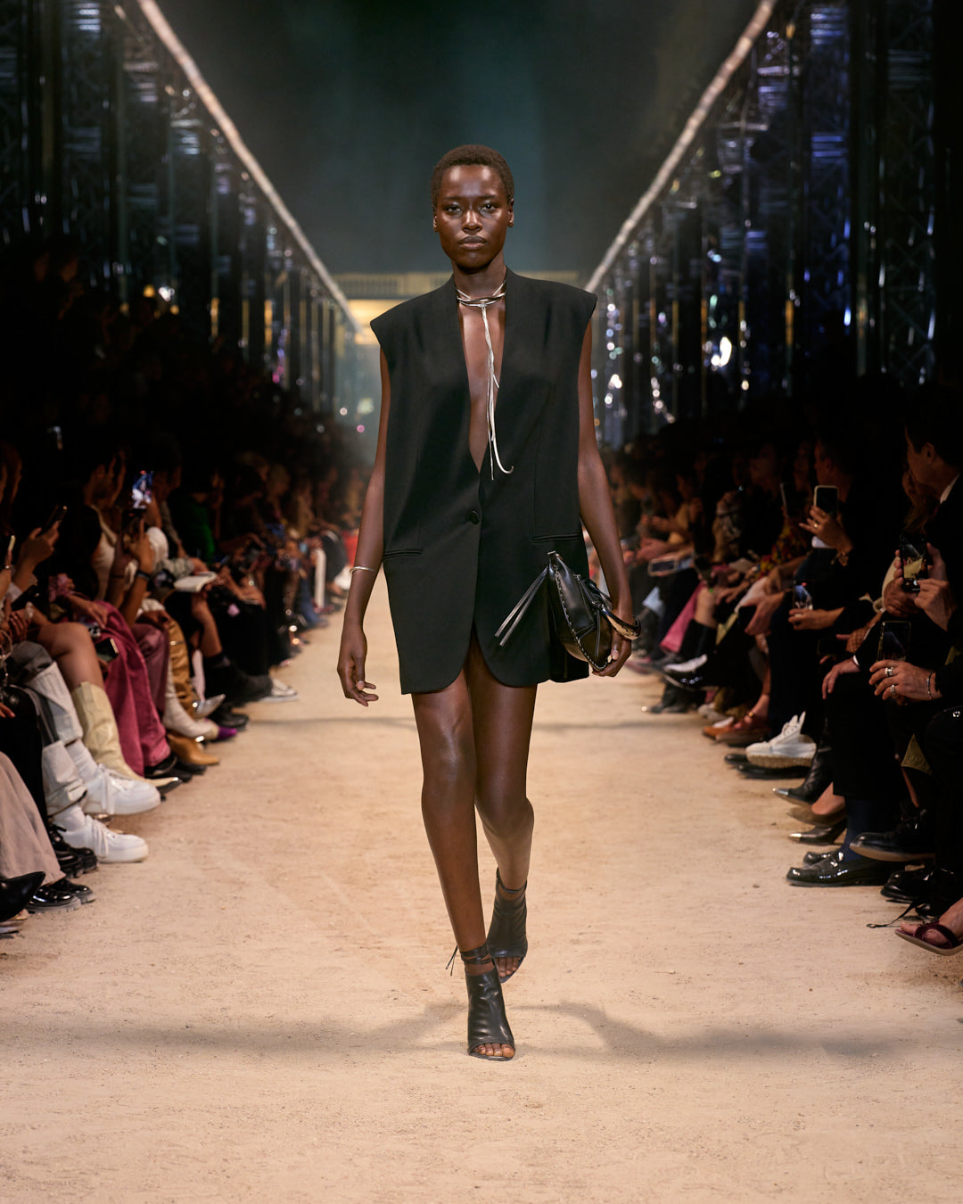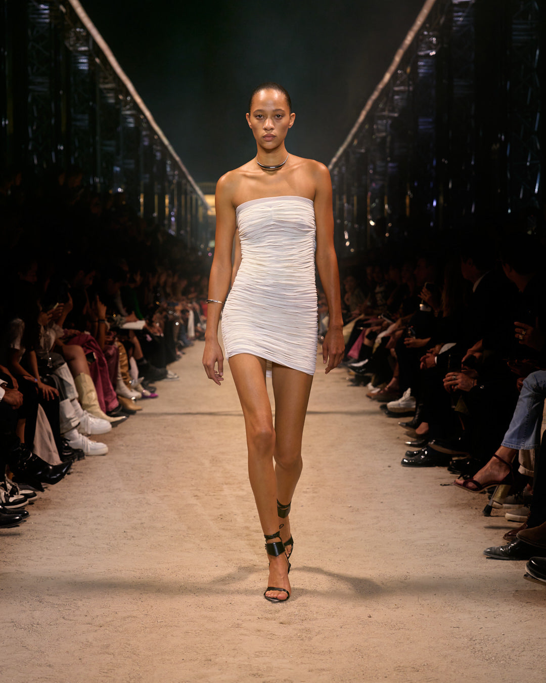 Parachute fabrics and wedge clogs further elevate the silhouette while structural silver earrings levitate like mobiles and sparkle to the rhythm of steps.