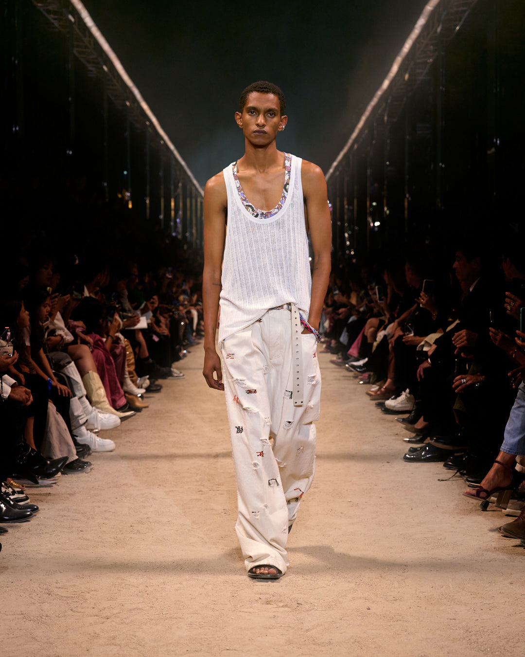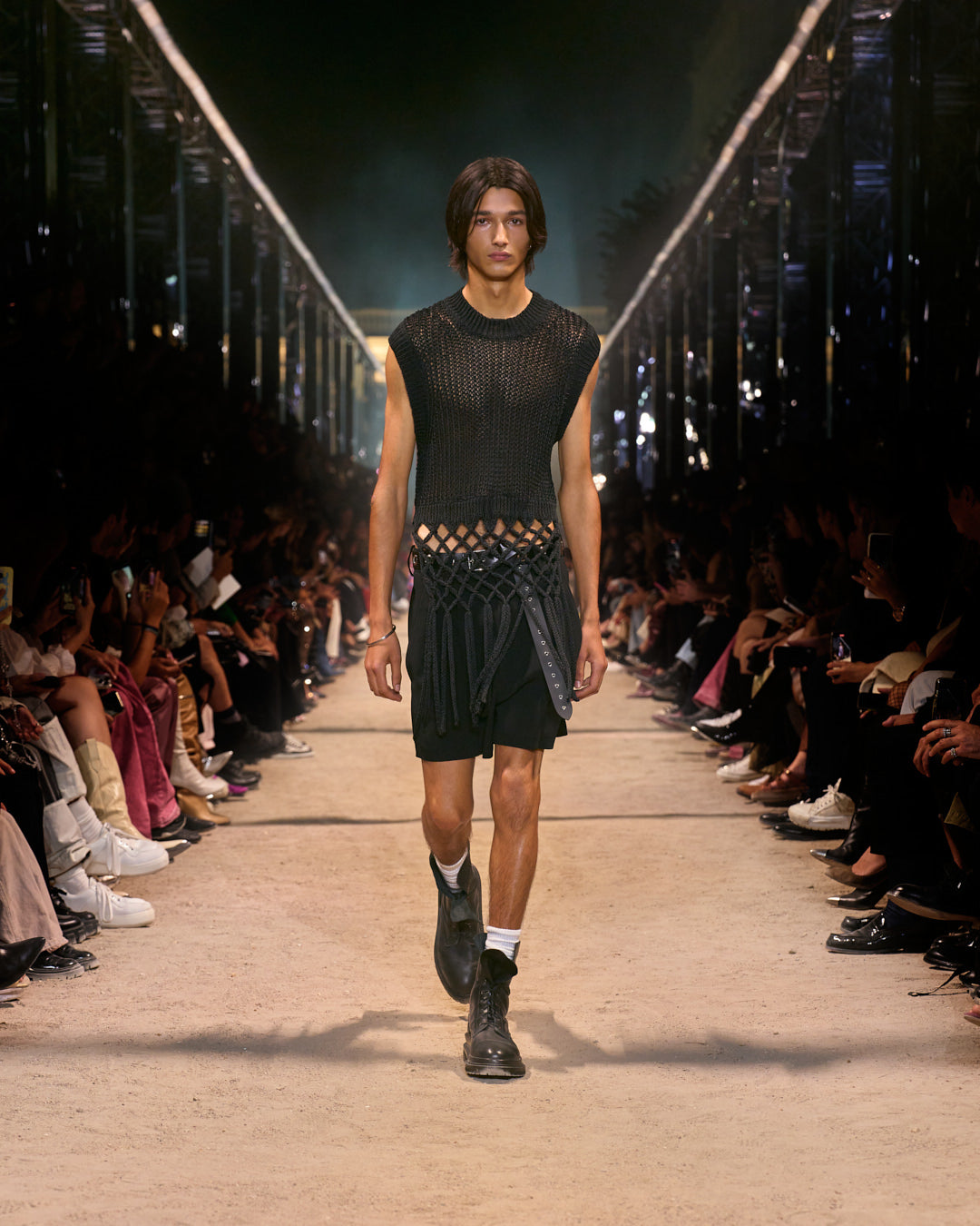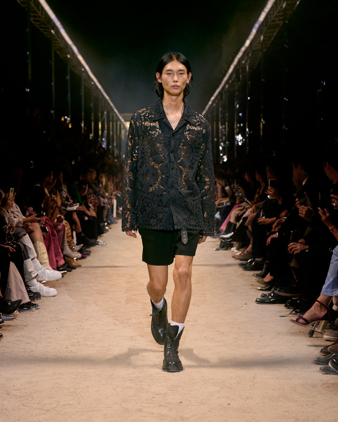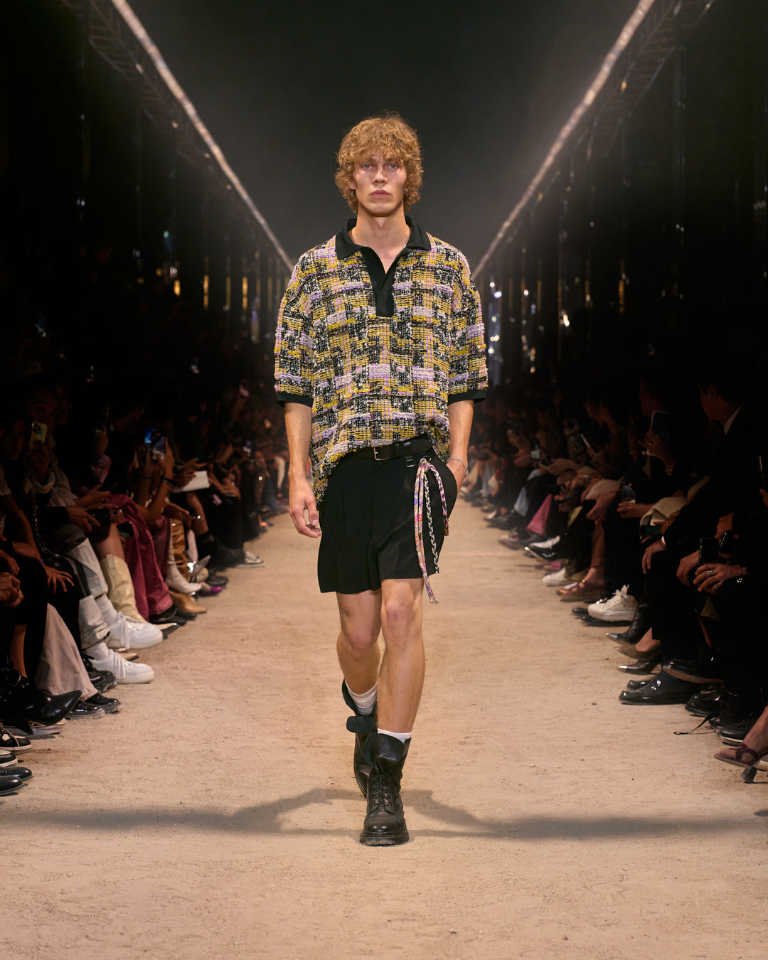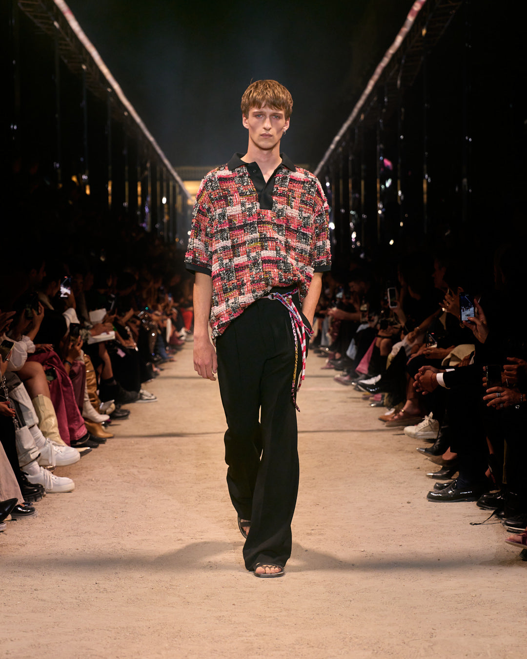 Parachute fabrics and wedge clogs further elevate the silhouette while structural silver earrings levitate like mobiles and sparkle to the rhythm of steps.