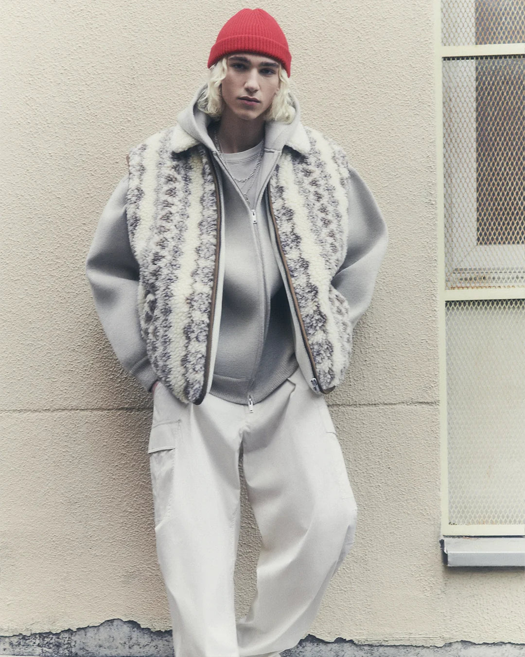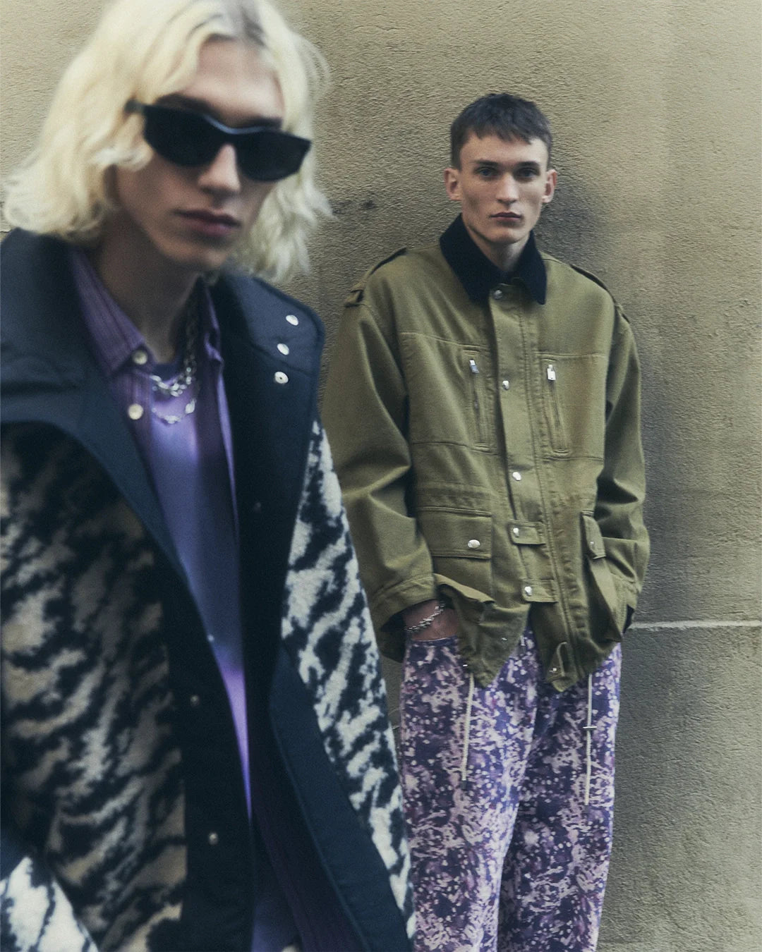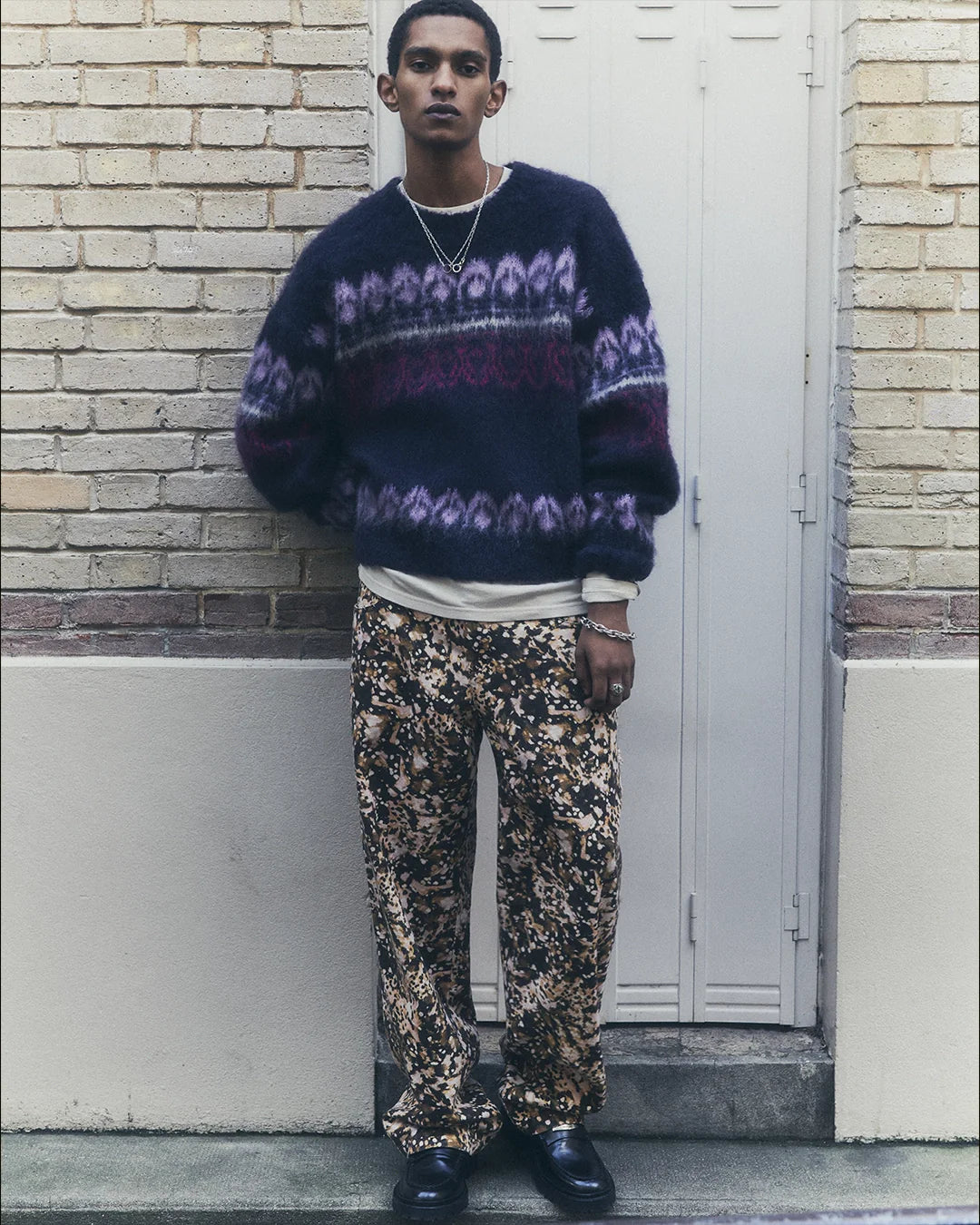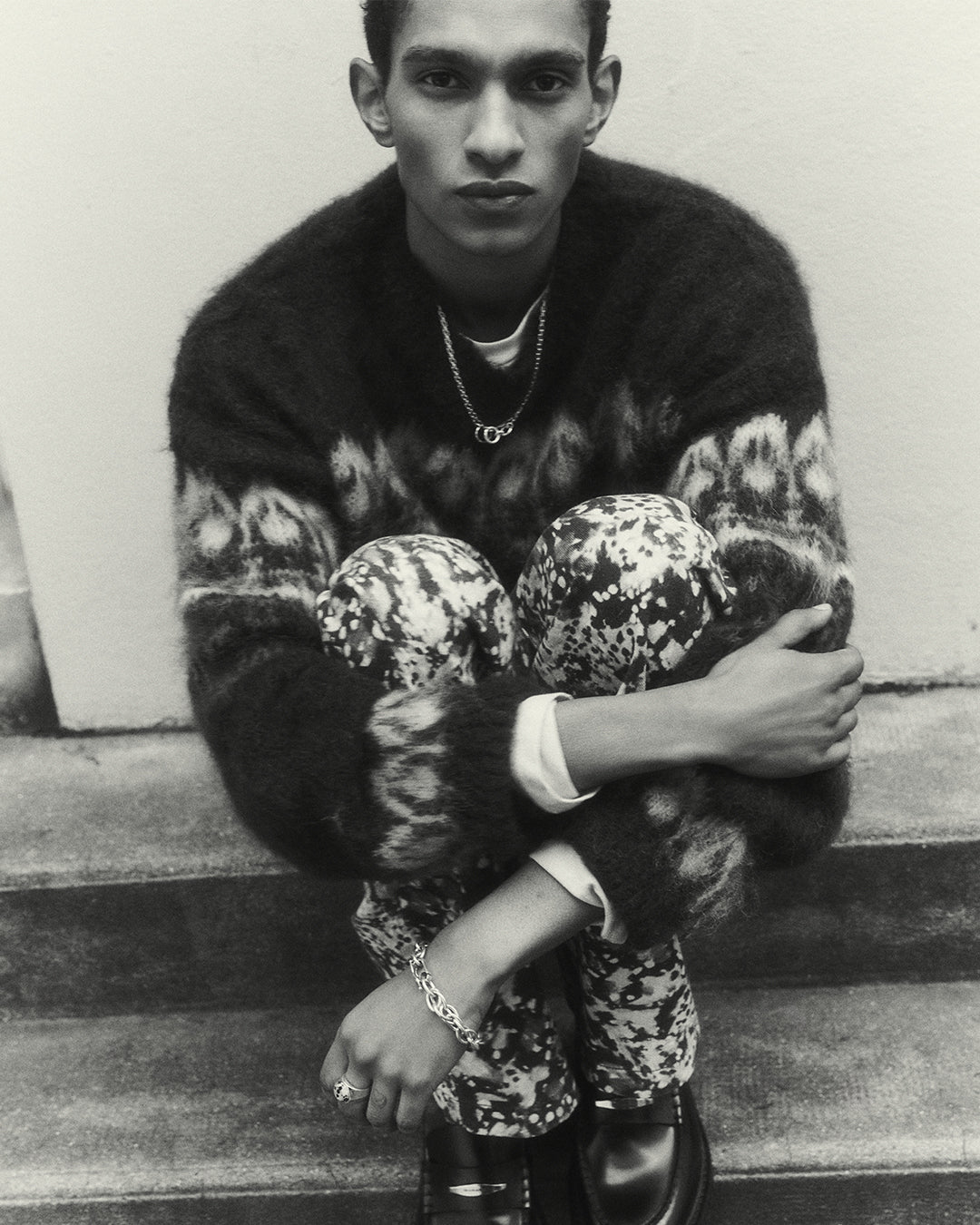 The radical layering of organic motifs and saturated colors finds balance in the comforting embrace of warm knits, textured outerwear with boxy proportions, a selection of more formal pieces, and a unique sense styling. His attitude is triumphant.
