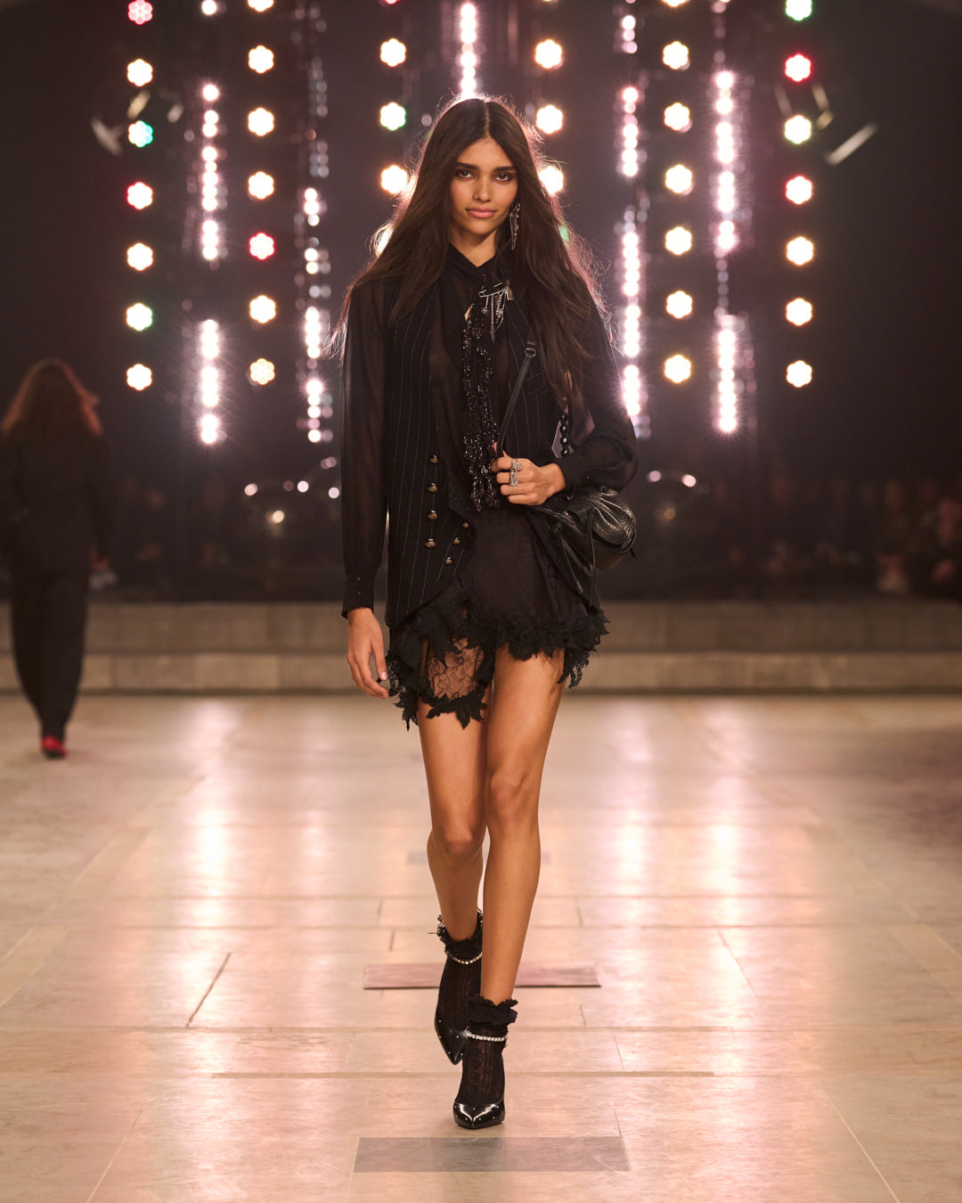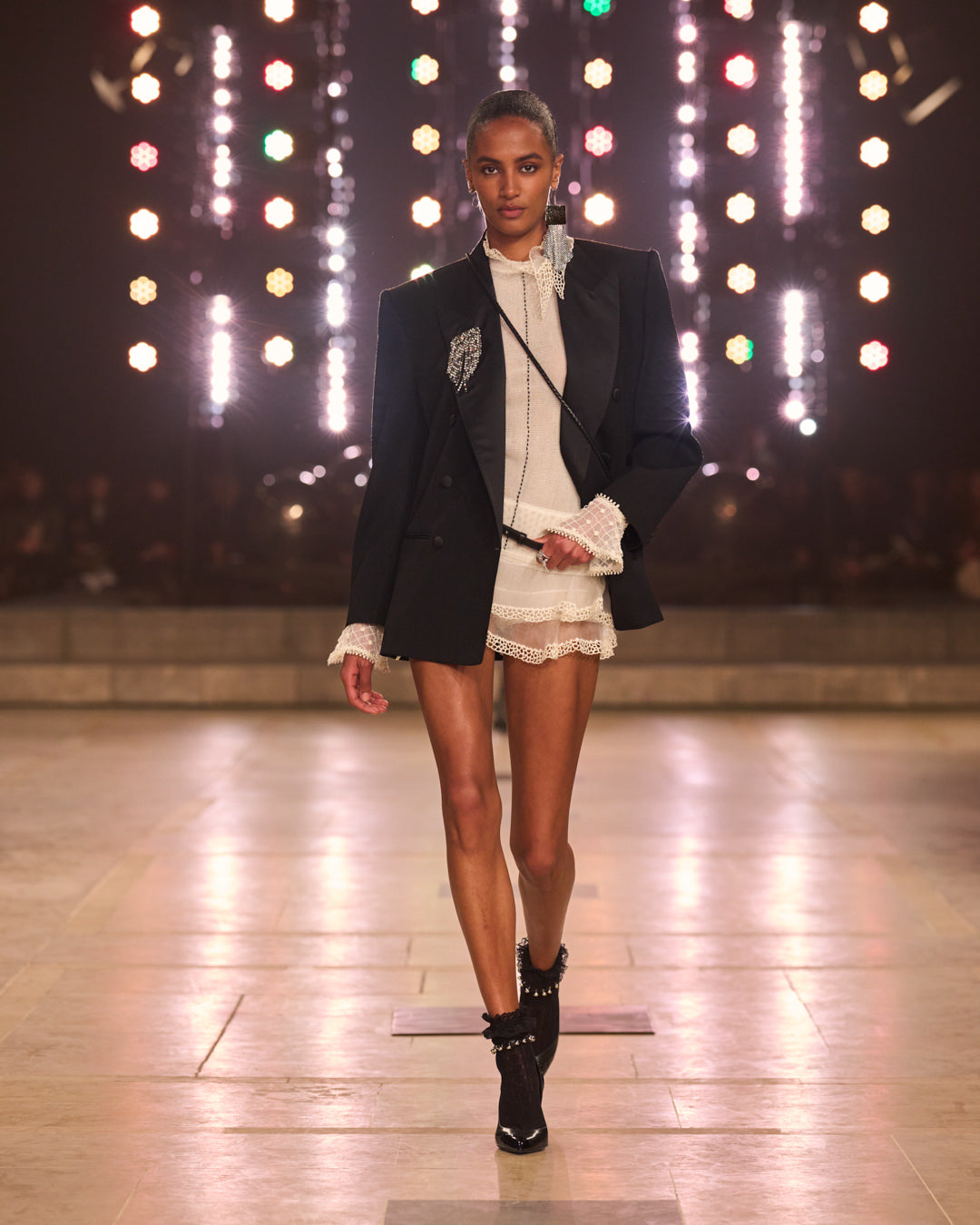 A tuxedo jacket with broad shoulders and satin lapels abandons trousers in favor of delicate lace ruffles. Alongside sheer layering, fluid fabrics, and lingerie-inspired pieces, a bohemian spirit emerges.