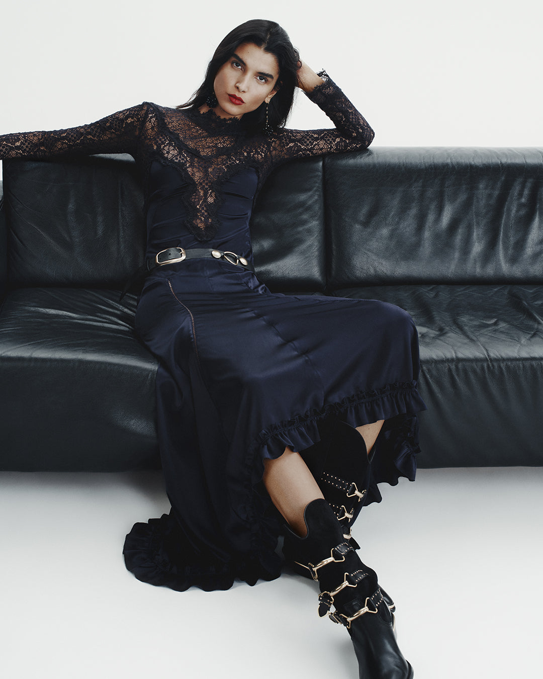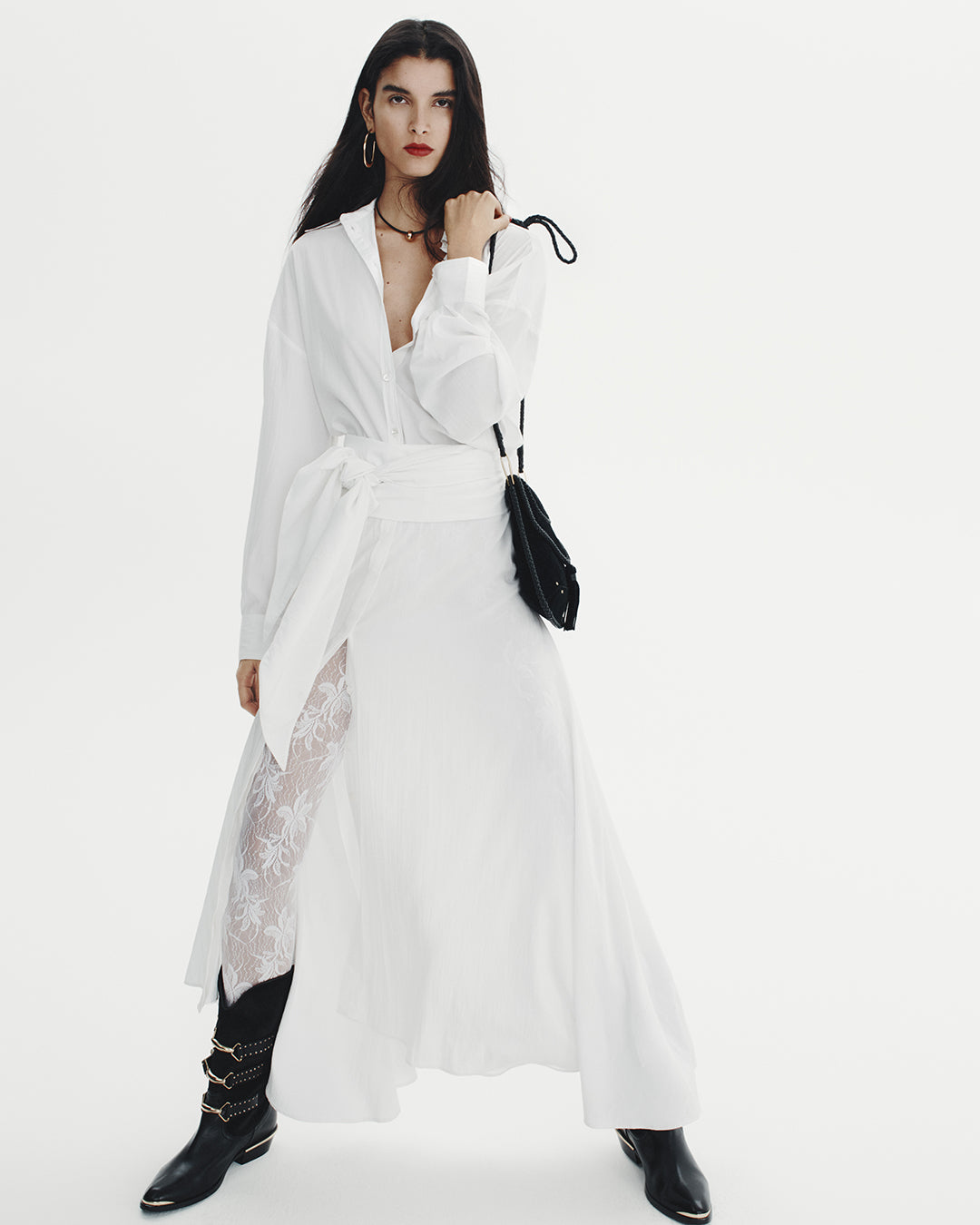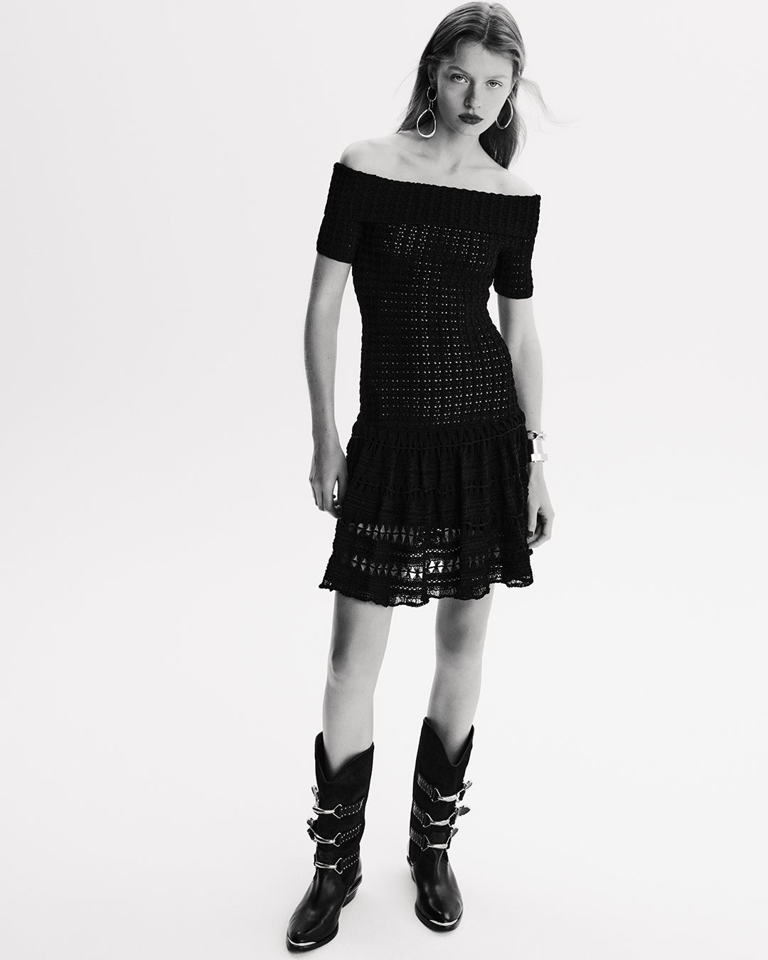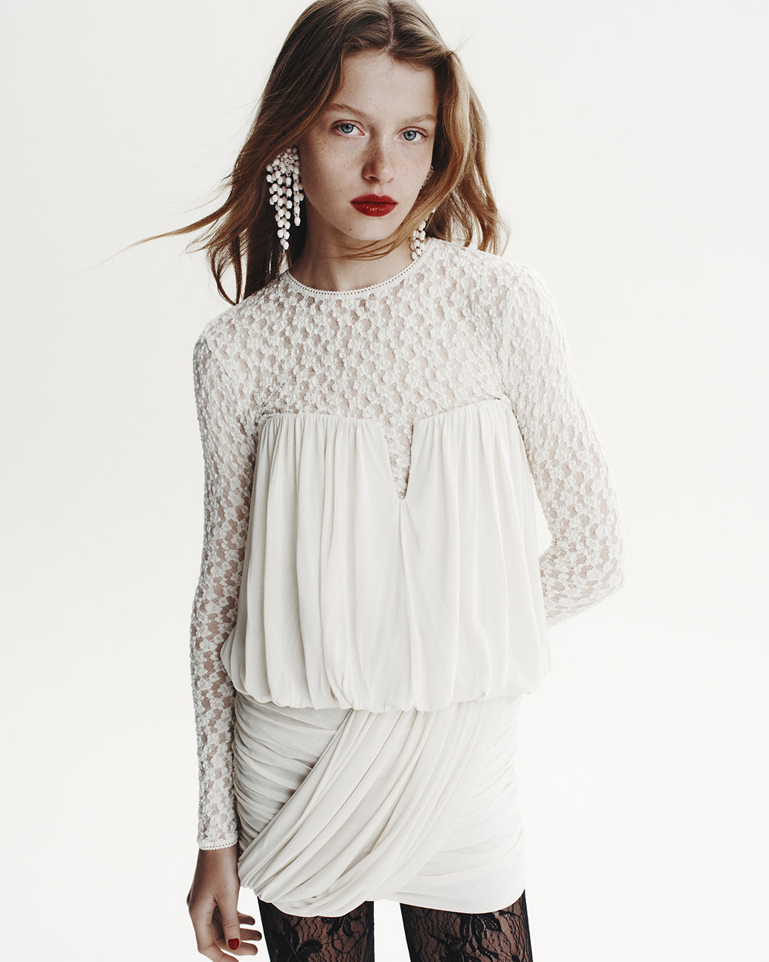 80s volumes merge with new wave sensuality through vintage lace, openwork knits, and embroidered tulle. Transparencies on the skin create patterns, replacing traditional prints.