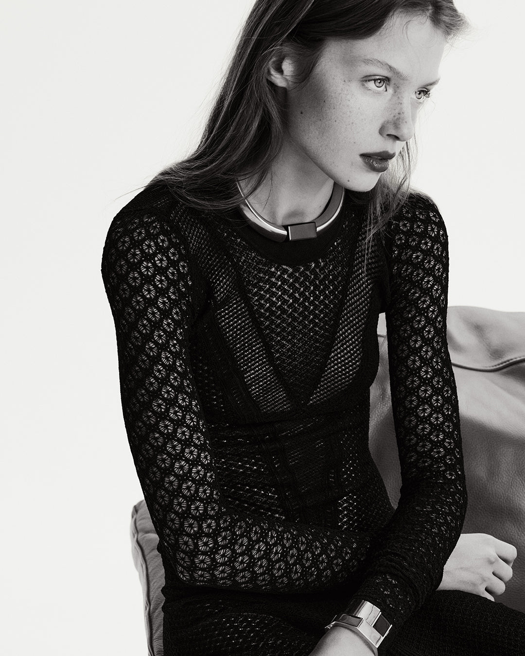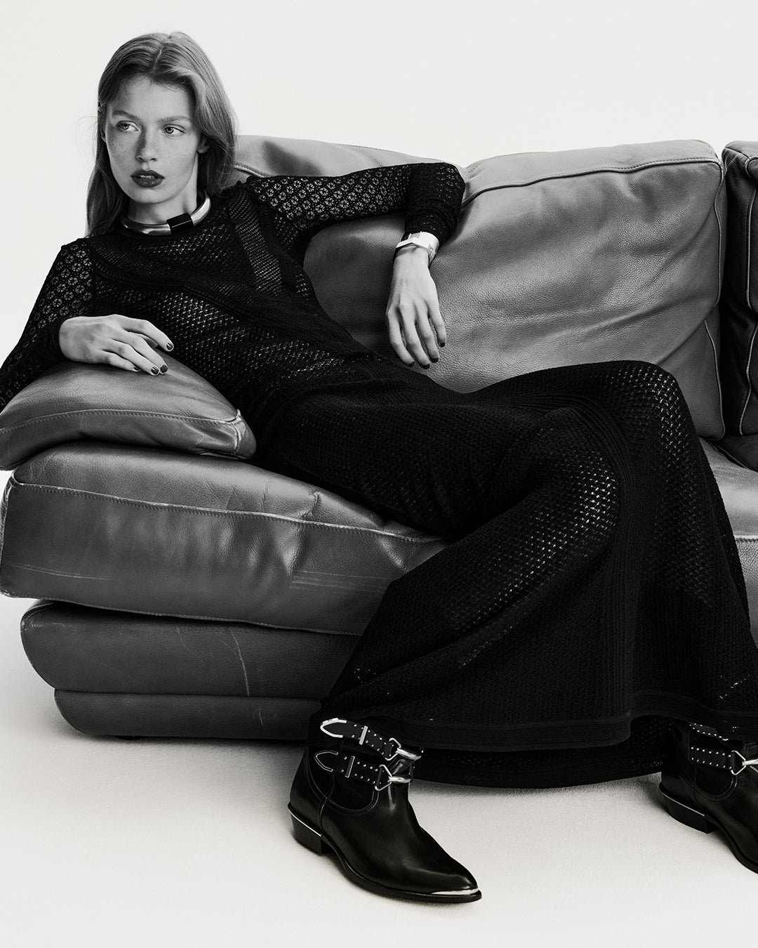 Draped mini-dresses in fluid jersey bring a contemporary dimension to a wardrobe that moves between boyish and ultra-feminine, cozy and tough - expressed through new soft knitted tailoring with straight lines.