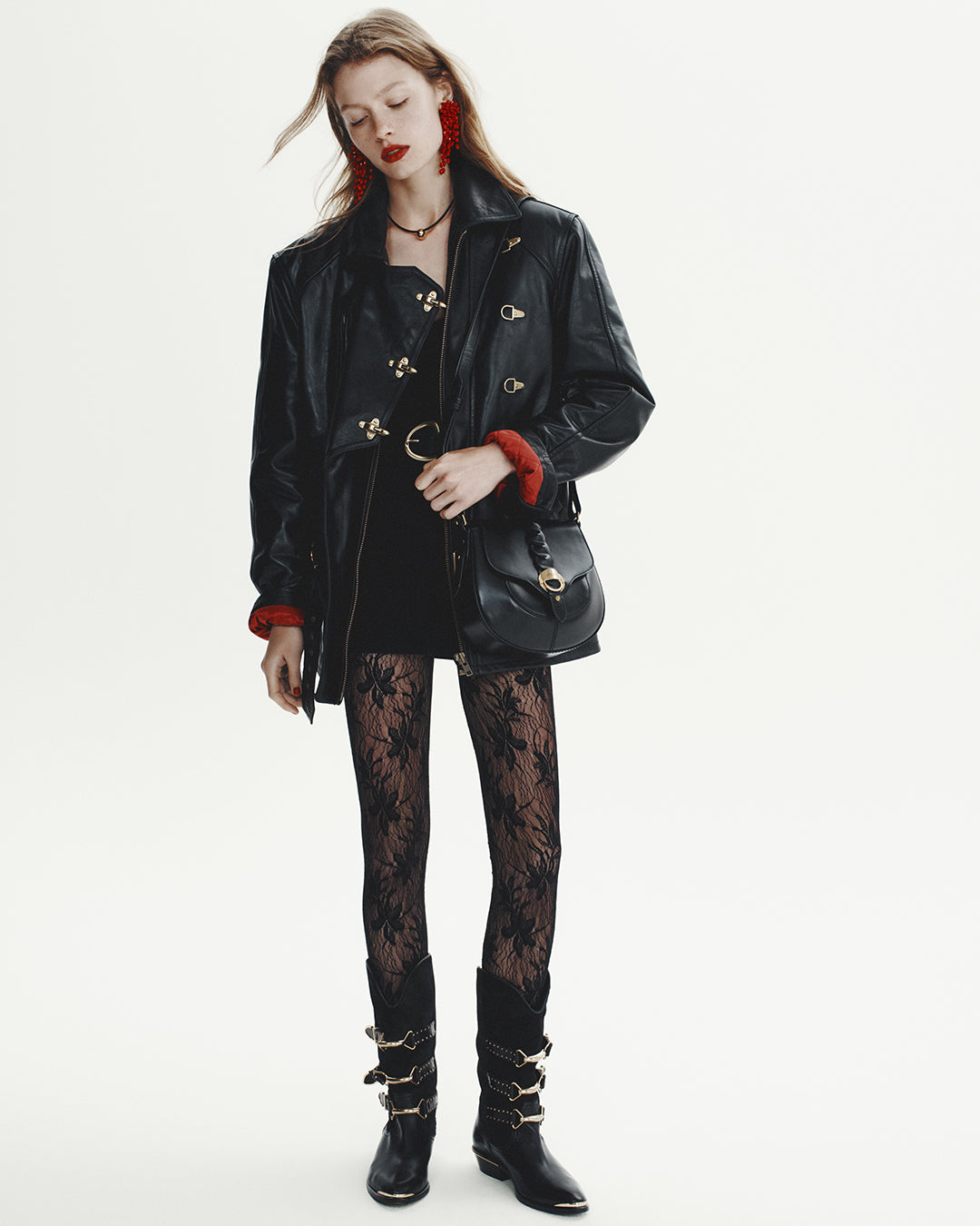 The palette builds on natural shades, tone on tone. Black and midnight blue carry metallic touches. Ecru and cognac, marked by red and orange accents, reference westernwear, a house signature.