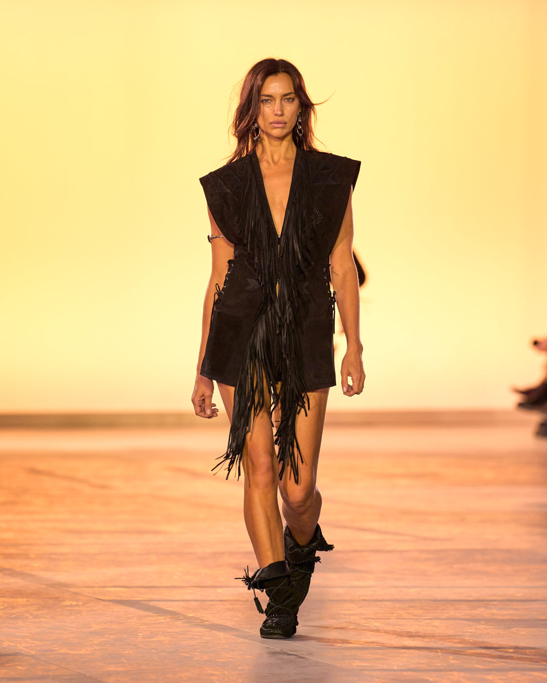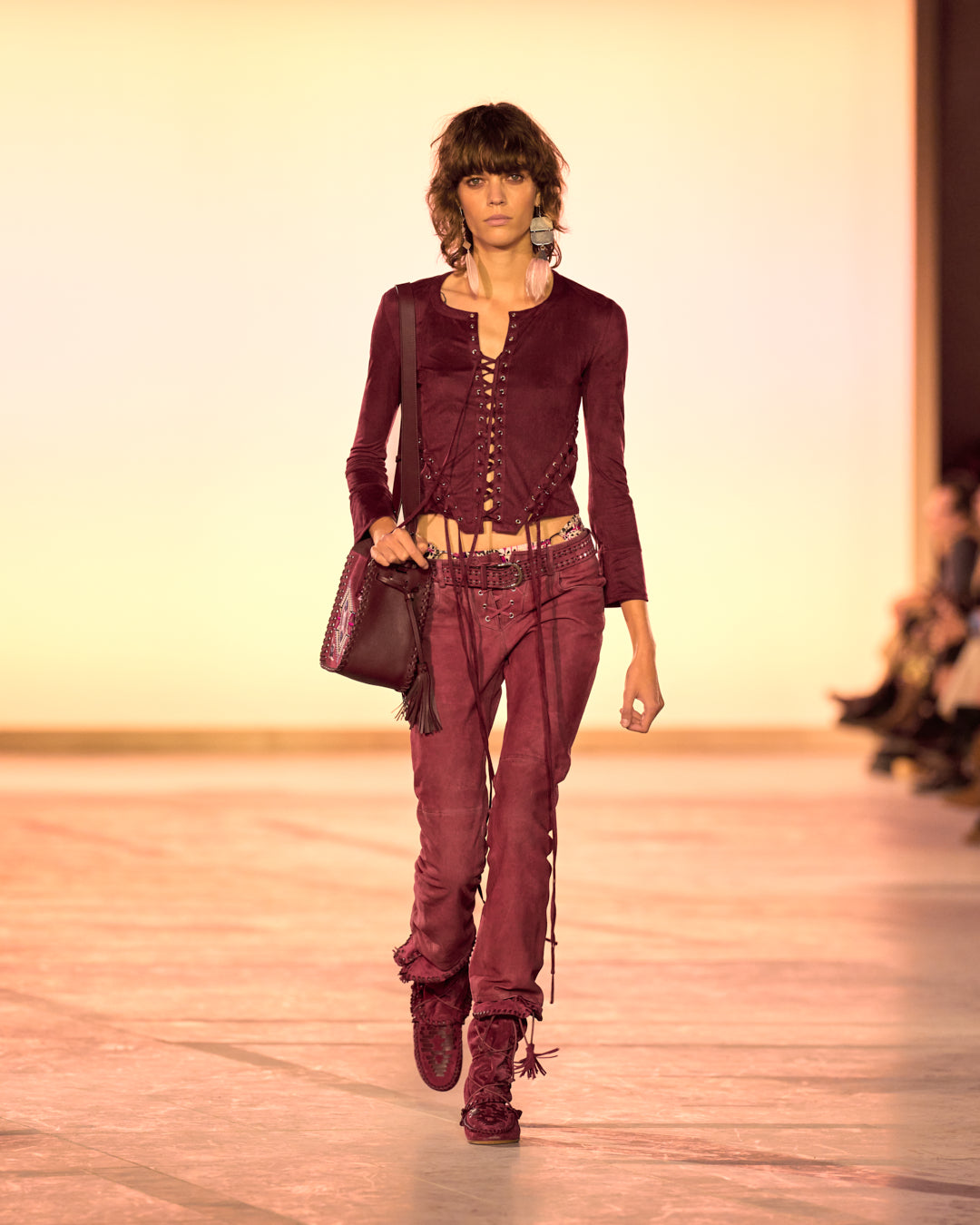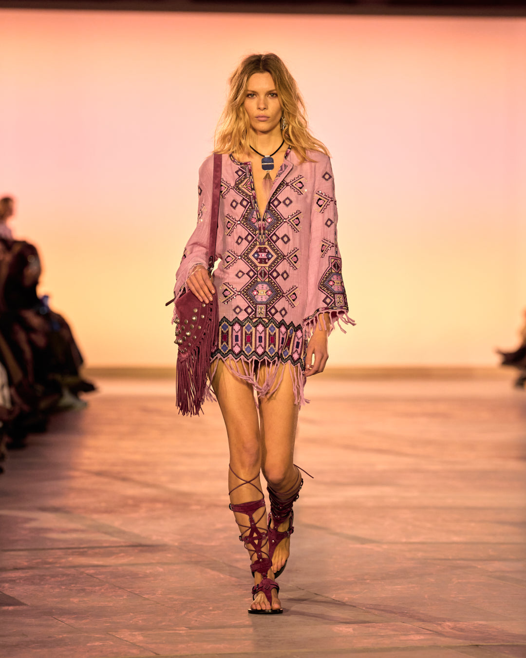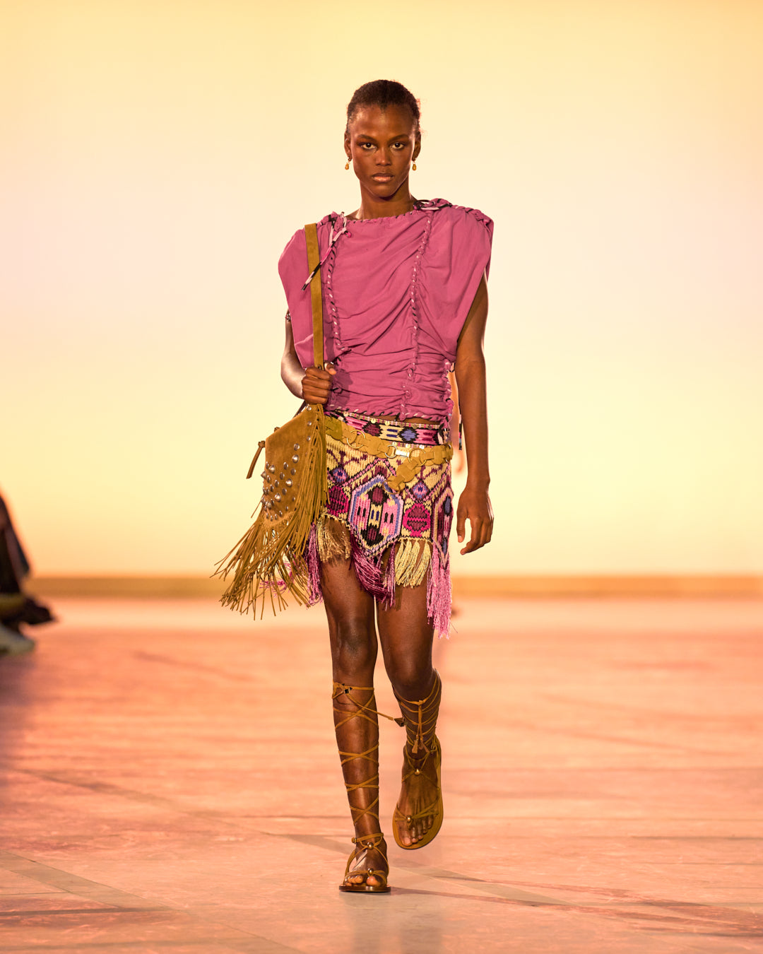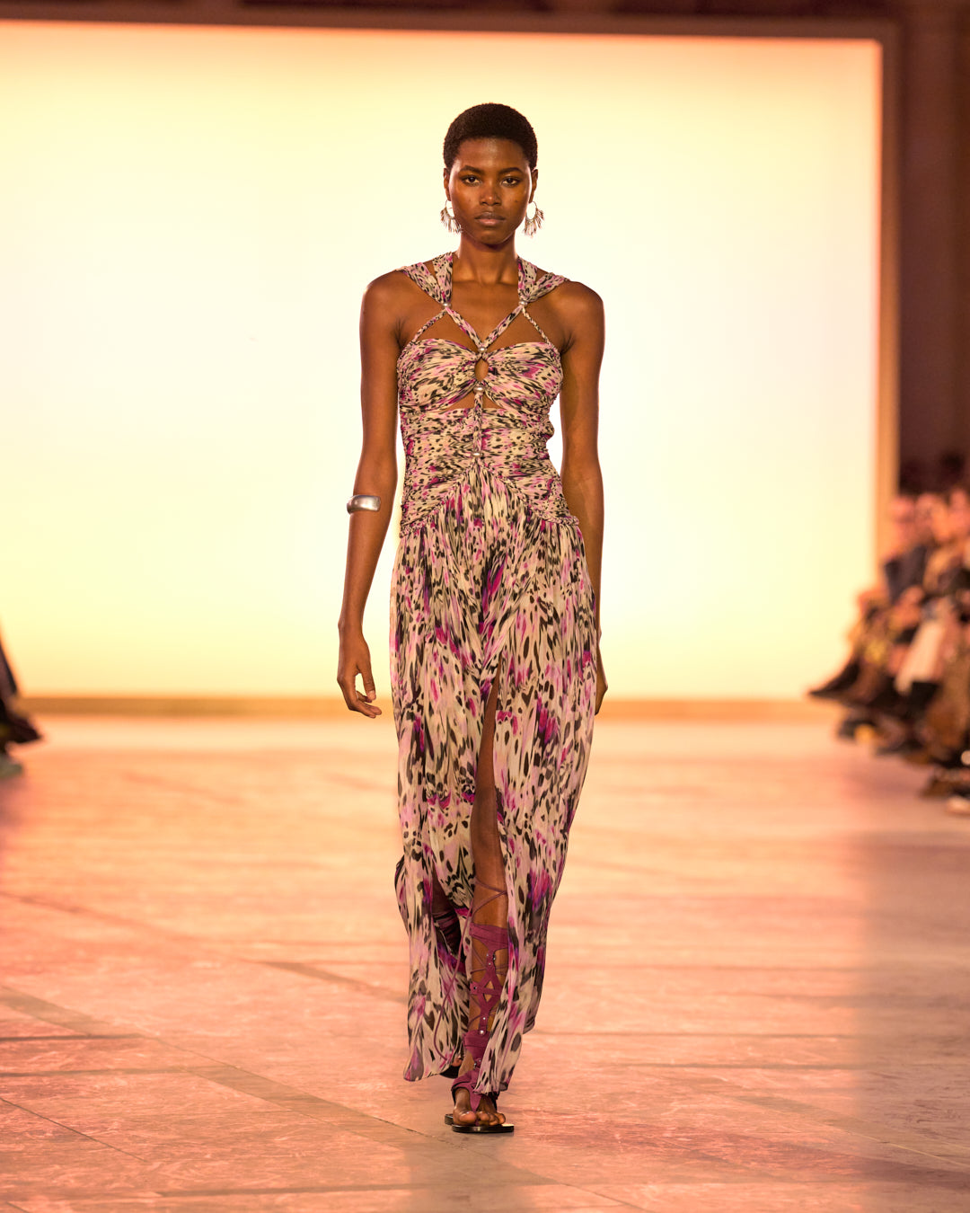 Illuminated by monoliths mimicking the gradient of the sky at sunset, the show’s set echoes the organic color palette of the collection. Pinks, oranges, sandy beige, and midnight blues are sharply contrasted by a series of minimalist black ensembles.