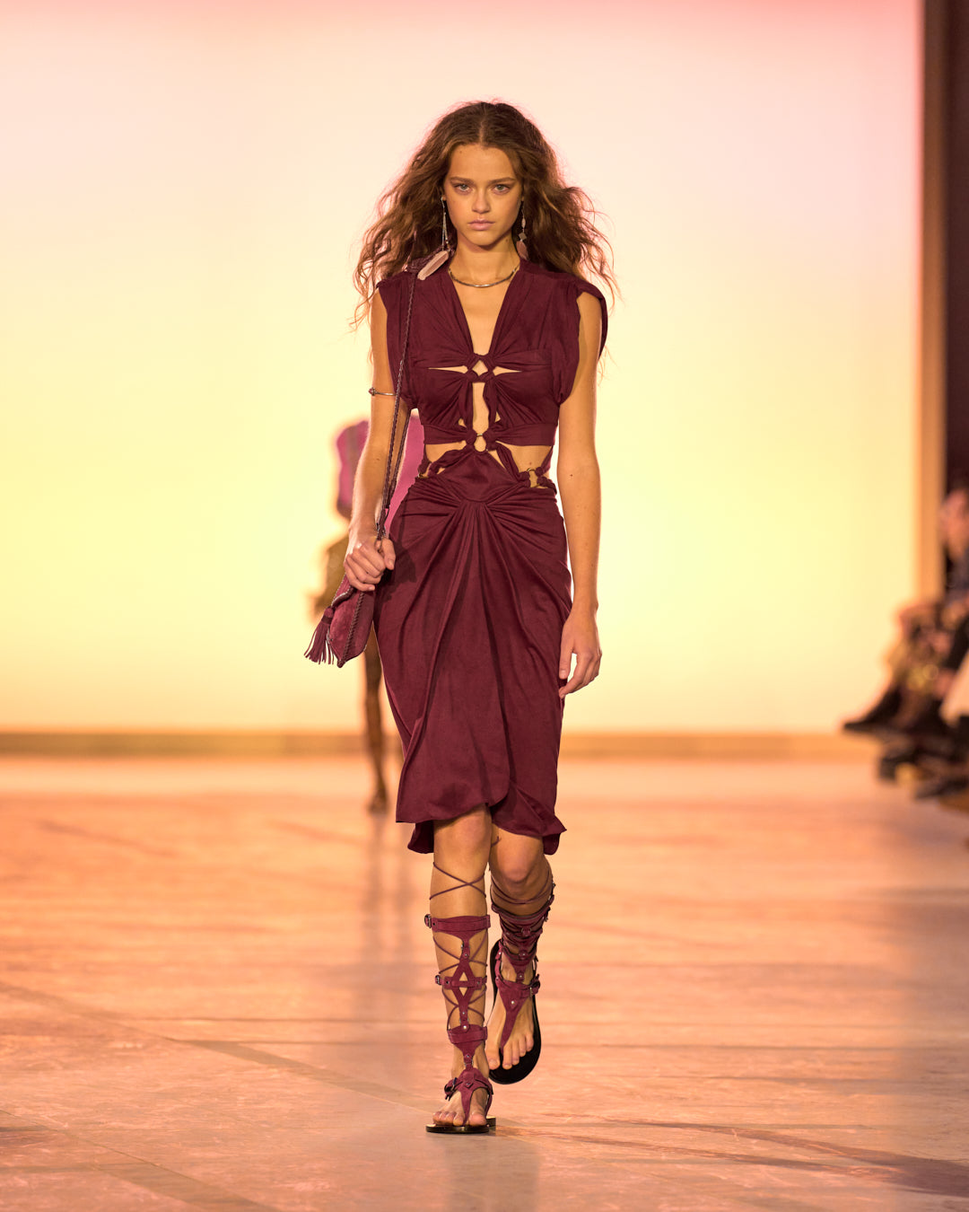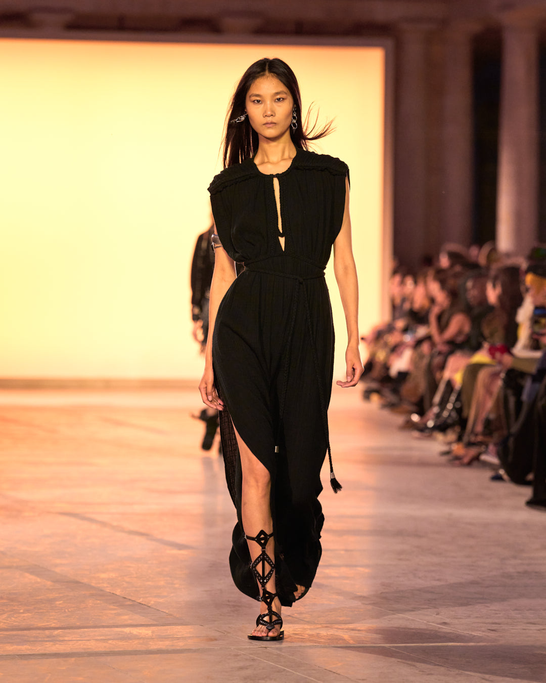 An epic dimension emerges, heightened by draped dresses whose lightweight chiffon floats with each step. Slit up to the waist and held by braided cords, these ties also cinch jersey stretch dresses and tops elsewhere in the collection.