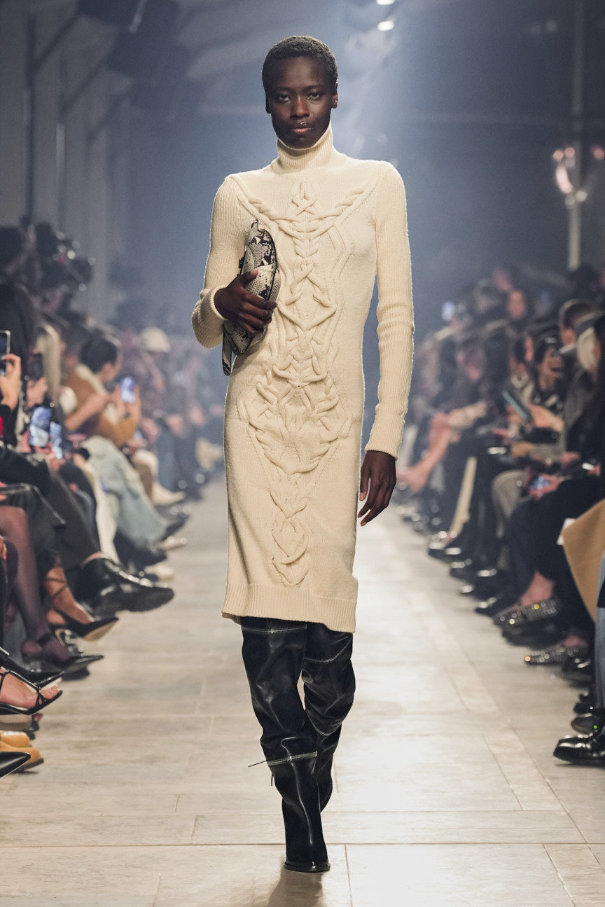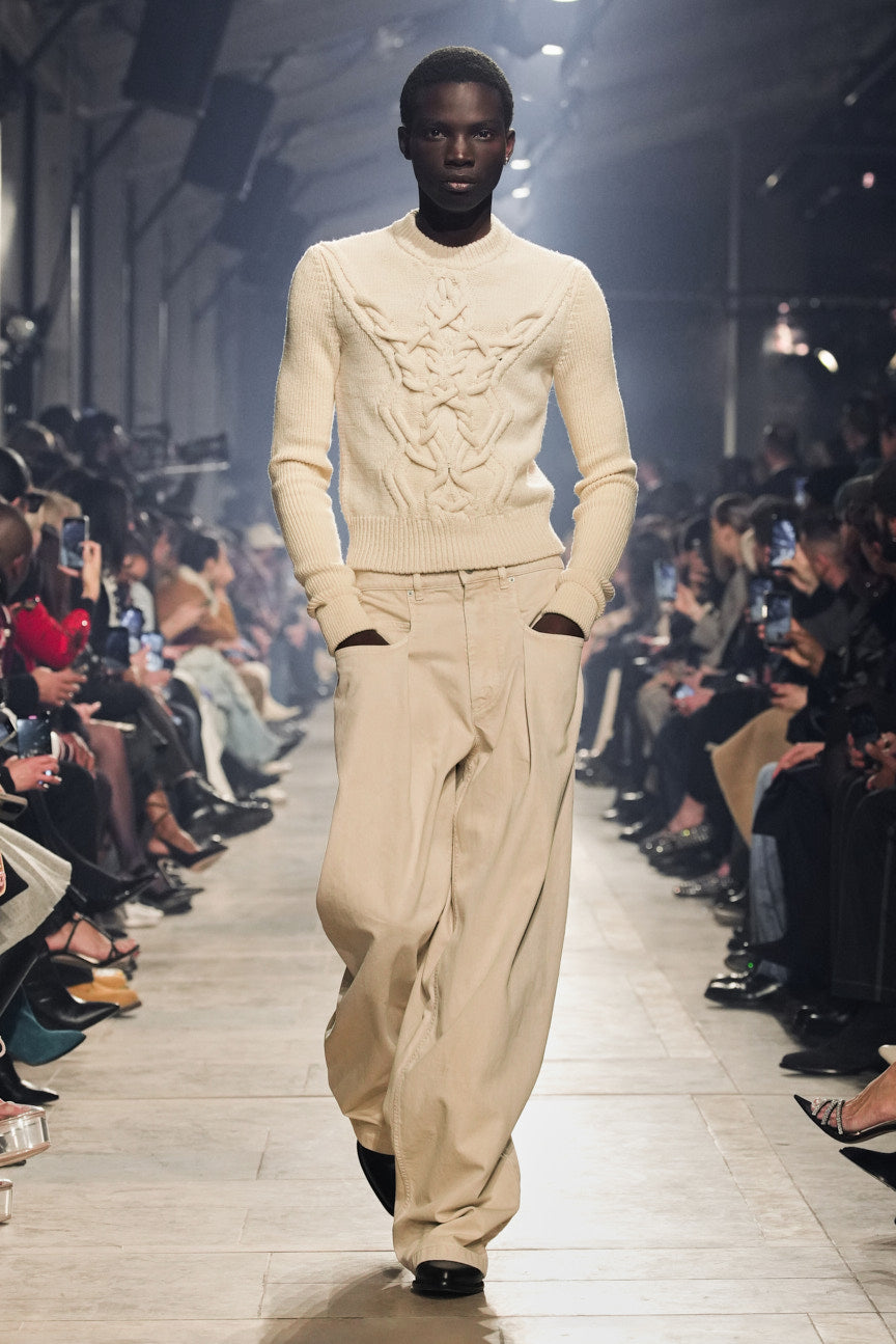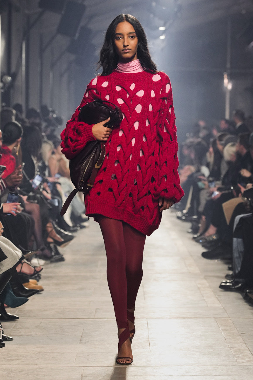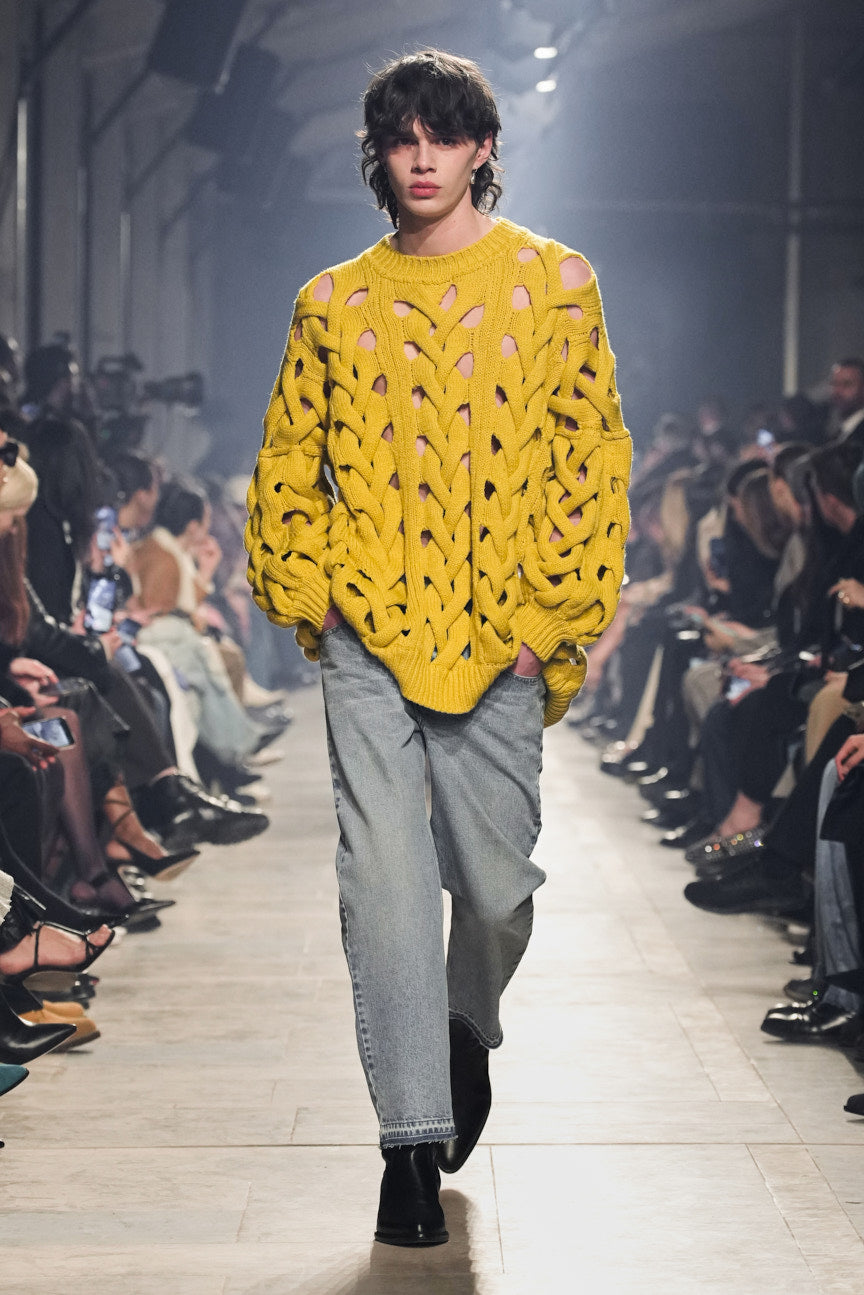 The graphic cut-outs of the flou shape new cleavages while plays on transparency subtly reveal parts of the body. These supple and feminine fabrics contrast with heavy cable knits, dyed denim, wool, and warm shearlings.