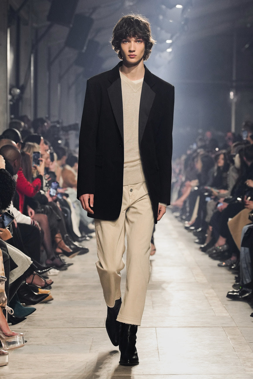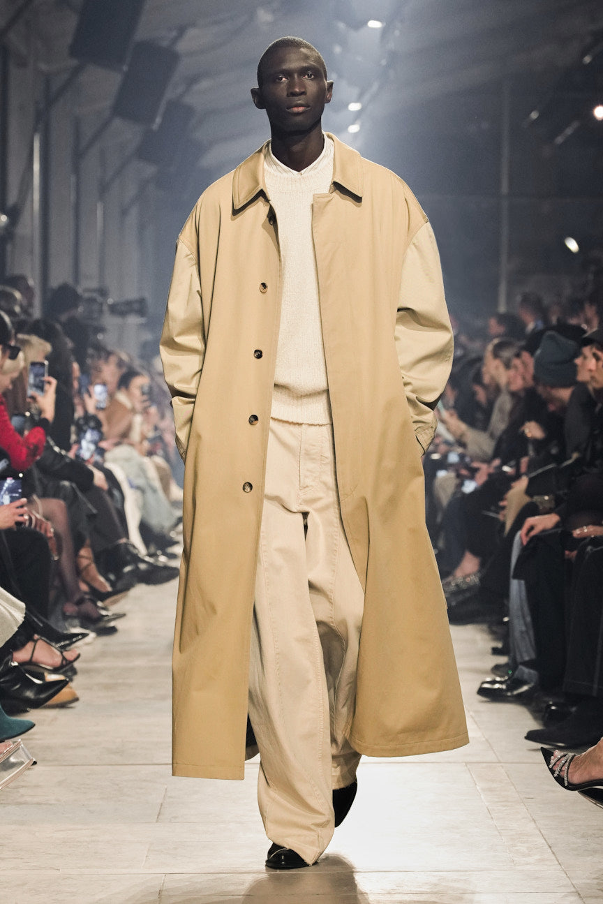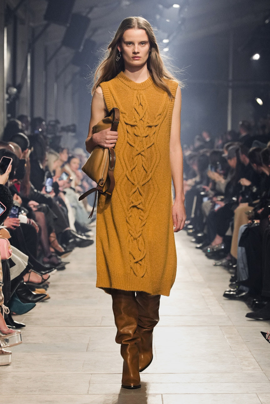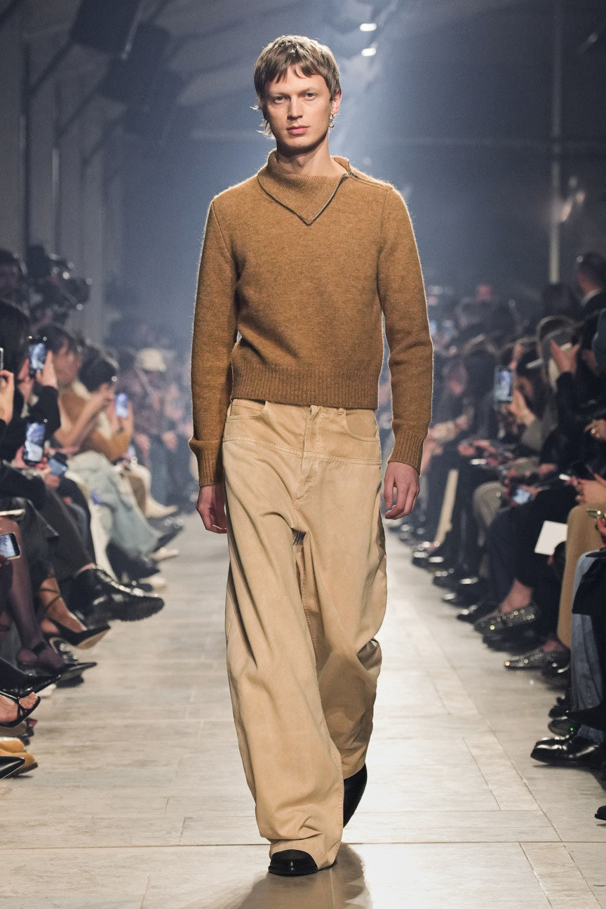 The graphic cut-outs of the flou shape new cleavages while plays on transparency subtly reveal parts of the body. These supple and feminine fabrics contrast with heavy cable knits, dyed denim, wool, and warm shearlings.