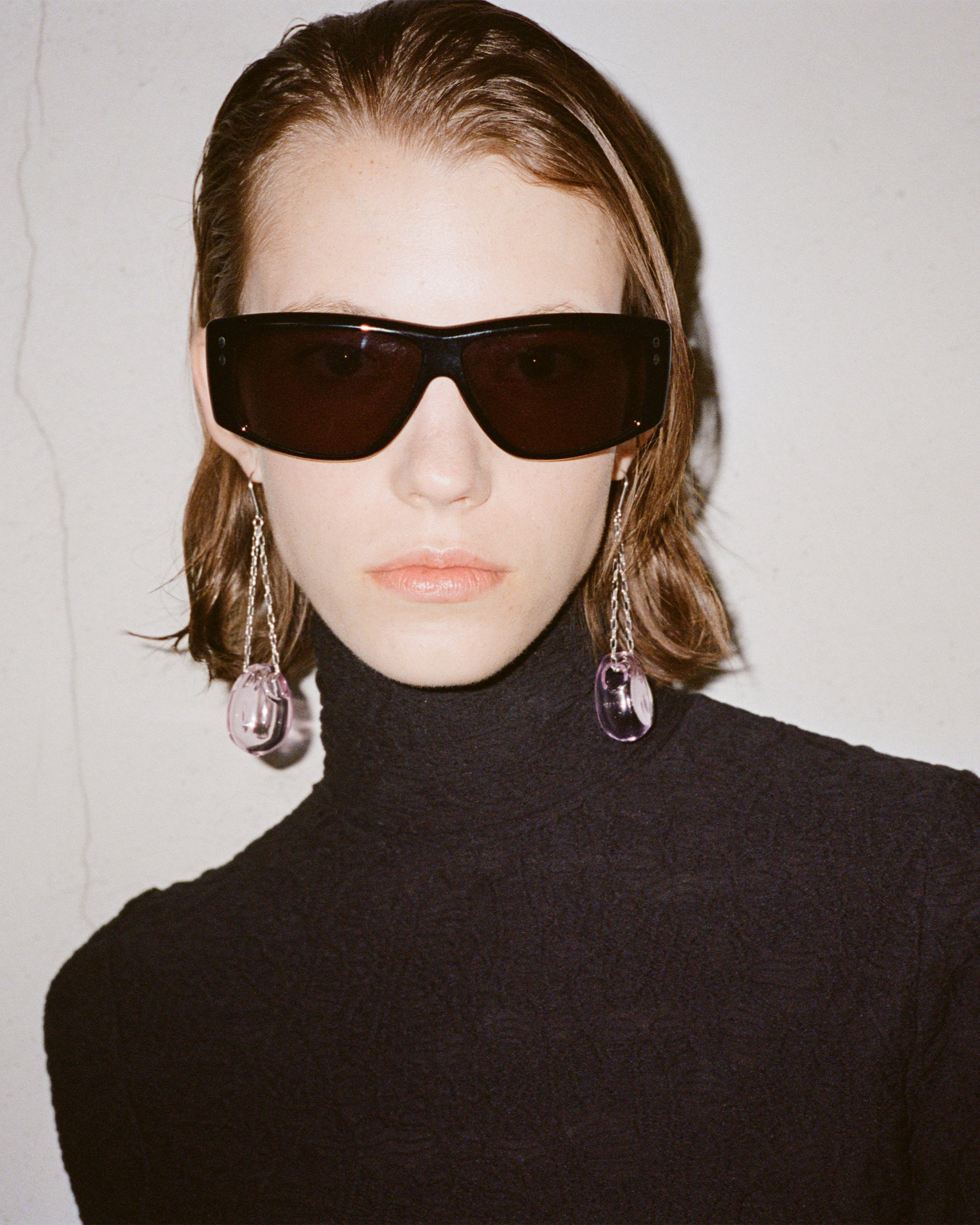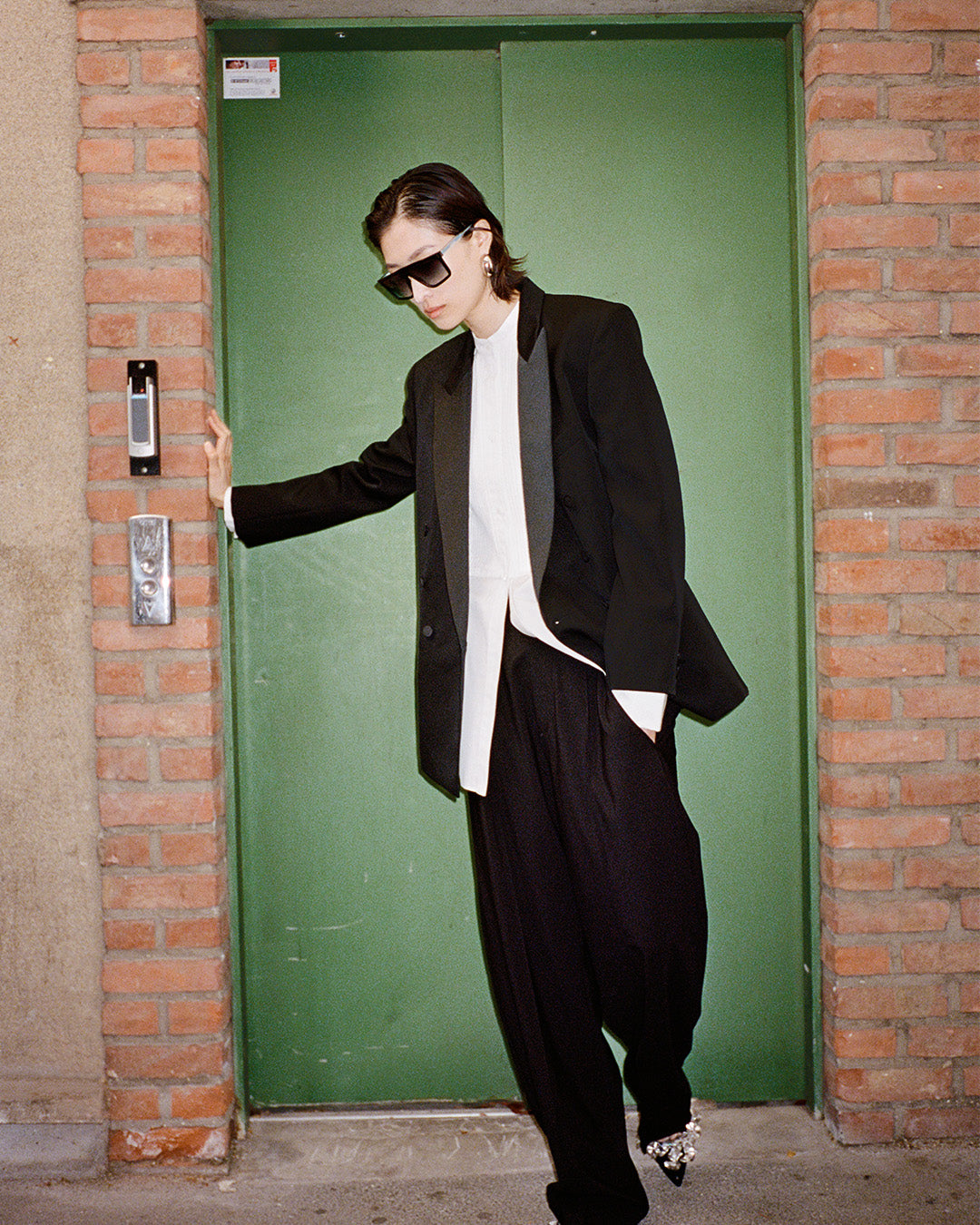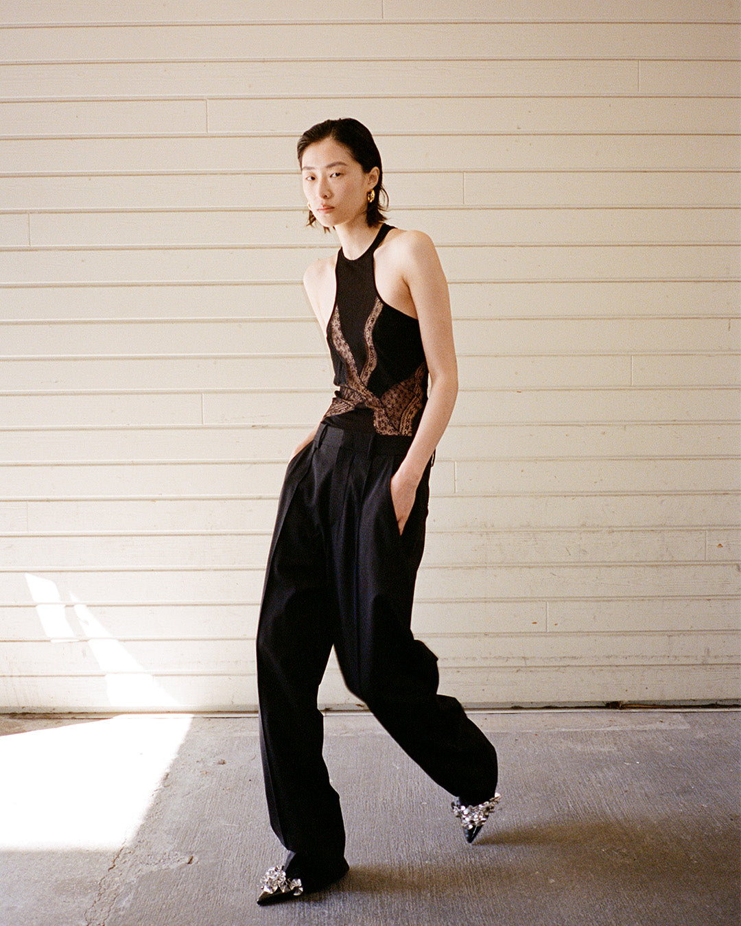 The homme/femme dichotomy lingers and leads to unprecedented fabric and volumes pairings. Outerwear pieces take round edges while tailoring items go slender. Silks and lace encounter tougher leathers and washed denim.