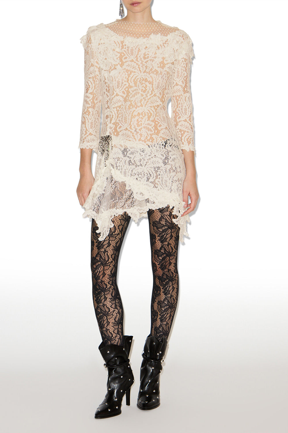 Passamanerie in pizzo su maniche, colletto e orlo inferiore