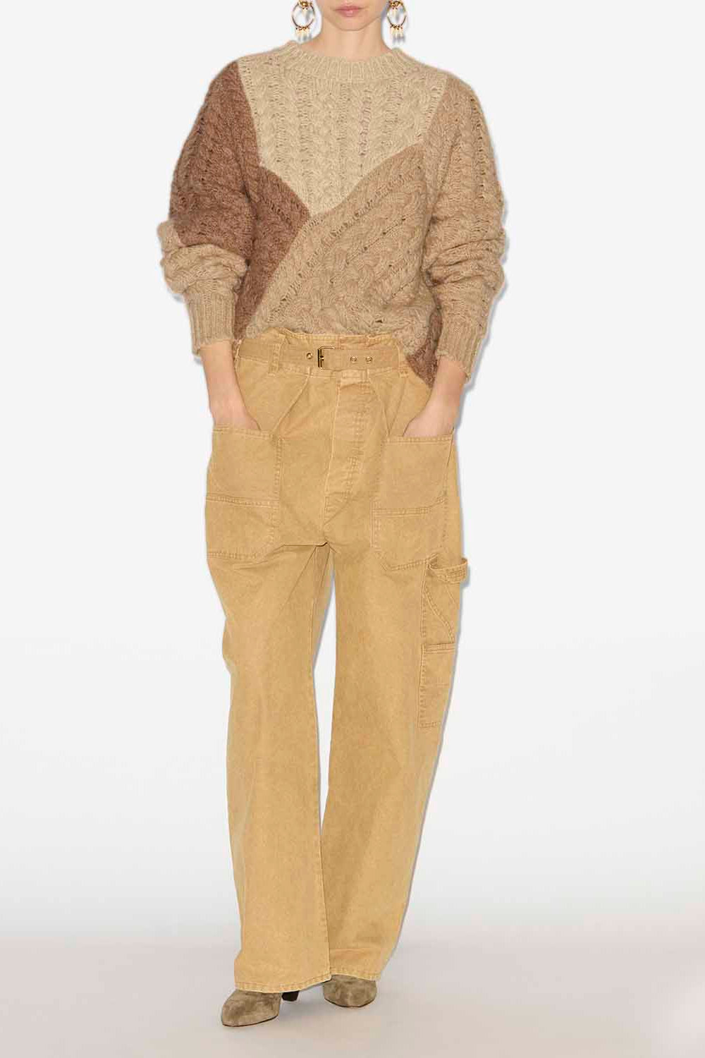 혼방 케이블 니트 소재의 패치워크 스웨터